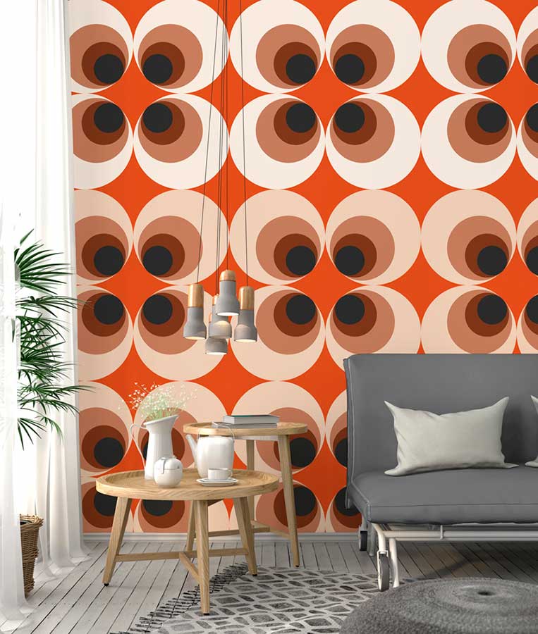 Maak een gewaagd statement met dit retro cirkelbehang in krachtige oranje, rode en zwarte tinten. De grote, concentrische cirkels creeren een opvallend grafisch patroon dat direct de aandacht trekt. Ideaal voor een accentwand in je woonkamer, lounge of kantoor voor wie durft te kiezen.