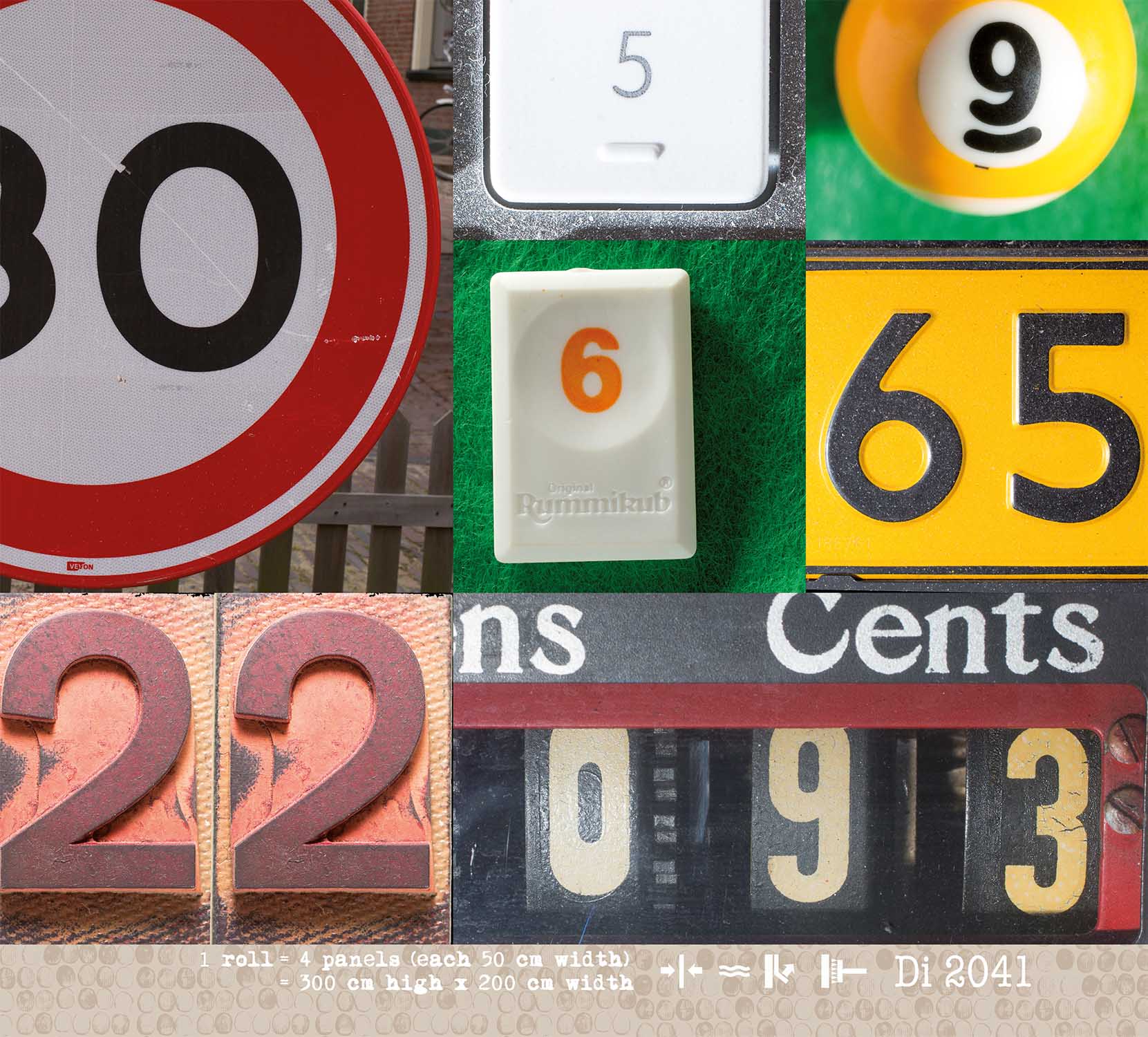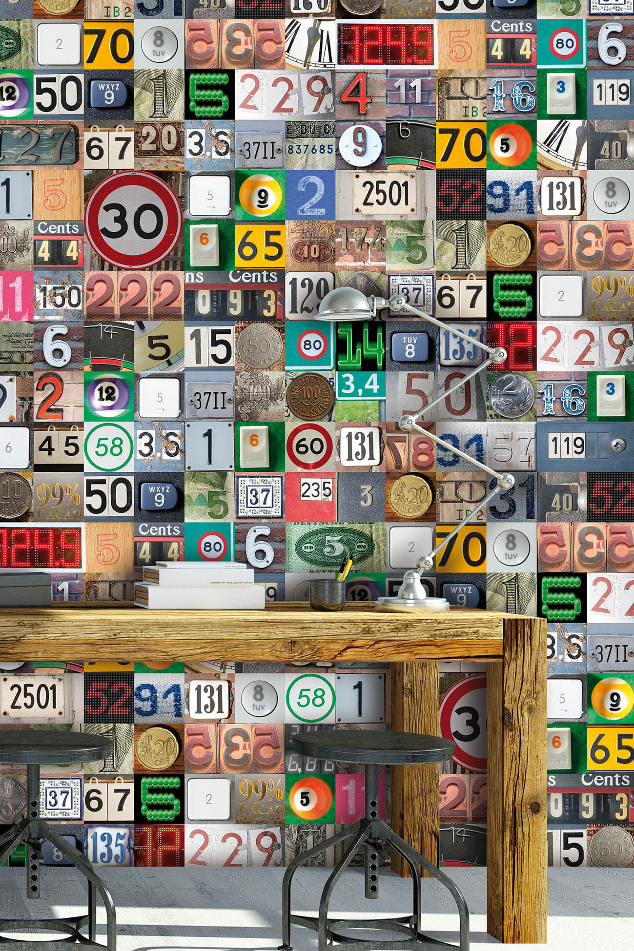 Geef de kinderkamer of tienerkamer een stoere, eigenzinnige uitstraling met dit Numbers behang. De kleurrijke mix van huisnummers, verkeersborden en vintage cijfers in allerlei lettertypen en kleuren maakt van elke muur een uniek kunstwerk. Dit behang past perfect bij een industriele of urban stijl en is een echte blikvanger.