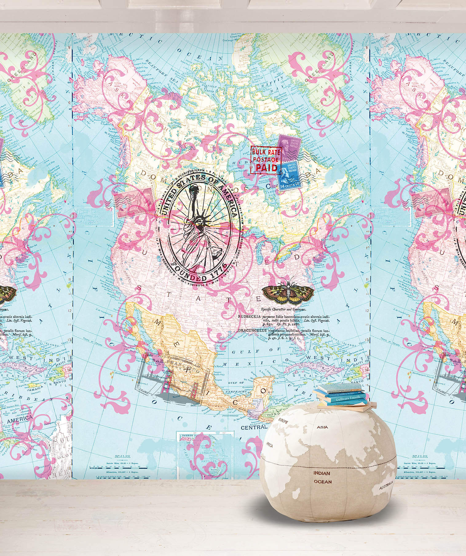 Neem je kind mee de wereld rond met dit Travel behang. Een kleurrijke wereldkaart in zachte pastelkleuren, verfraaid met een vintage kompas, postzegels en roze sierlijke krullen. De zachte blauw- en rozetinten maken het geschikt voor zowel een meisjes- als jongenskamer. Perfect voor kleine ontdekkingsreizigers.