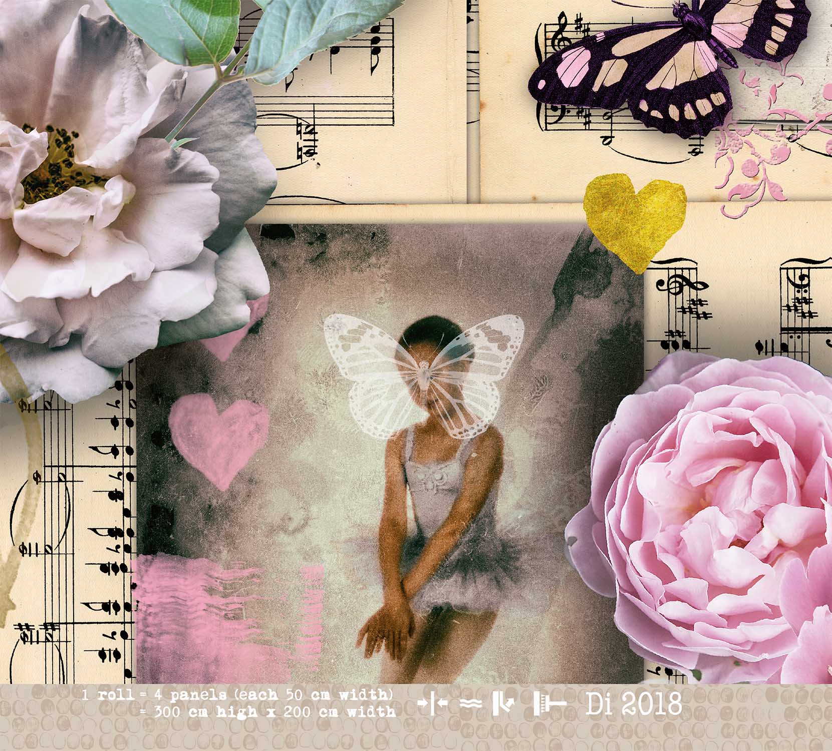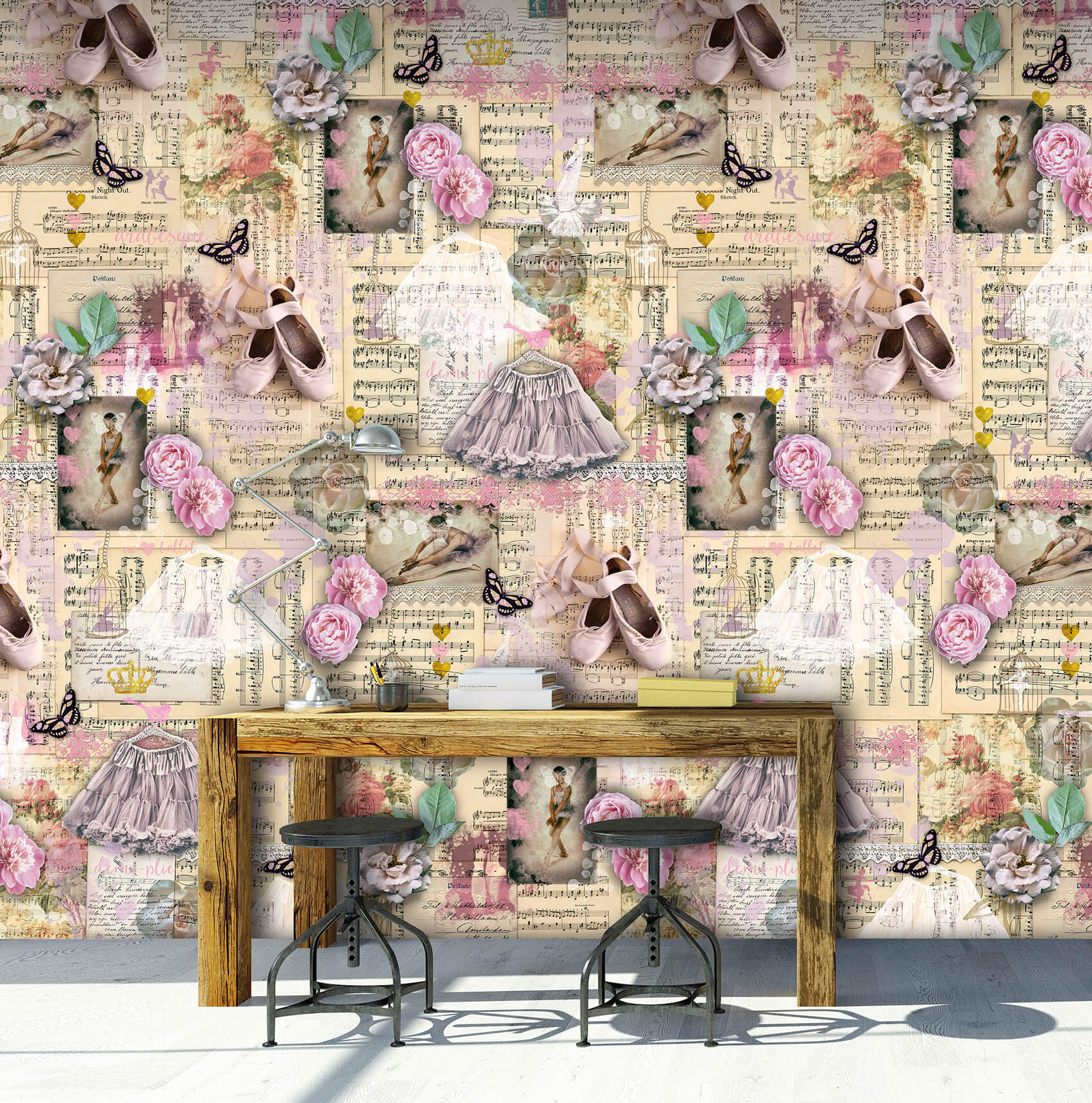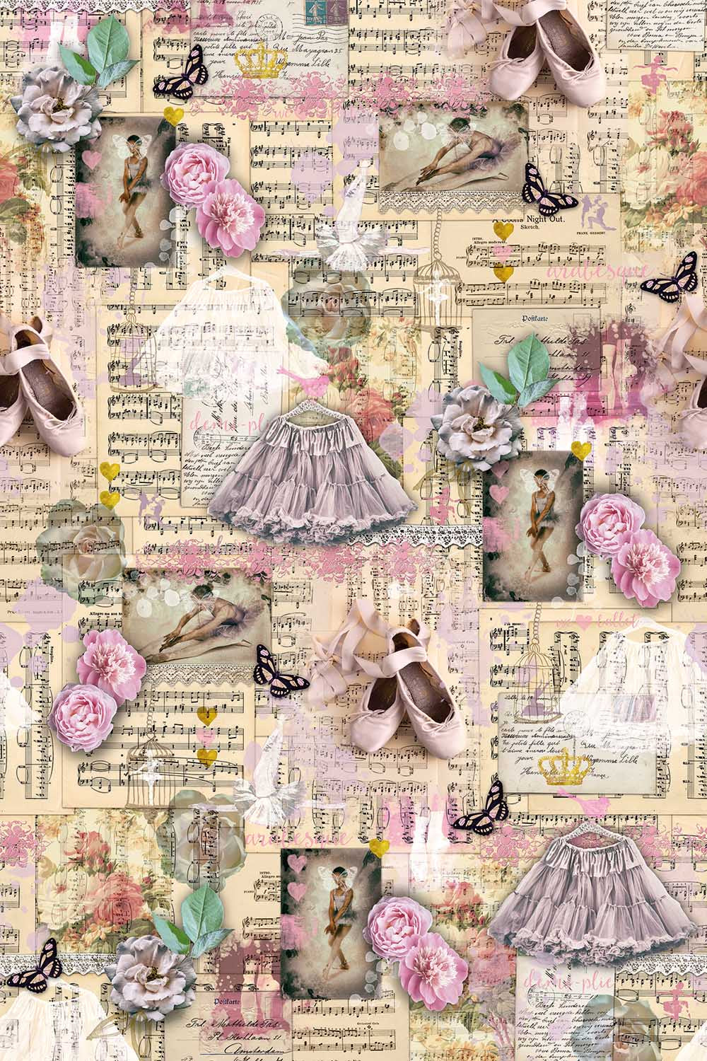 Stap terug in de tijd met dit Vintage Ballet behang. Een romantische collage van oude balletillustraties, spitzen, roze tutu’s, rozen, vlinders en muzieknoten op vergeelde papieren. De warme vintage tinten in roze, beige en goud creeren een nostalgische sfeer die perfect past in een meisjeskamer of tienerkamer.