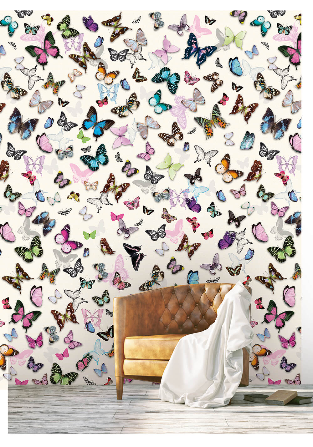Het Butterflies behang brengt een wolk van kleurrijke vlinders naar je interieur. Tientallen vlinders in alle kleuren van de regenboog, van felroze en koningsblauw tot zachtgroen en oranje, fladderen over een lichte achtergrond. Elke vlinder is uniek in vorm en kleur, wat het geheel speels en levendig maakt.