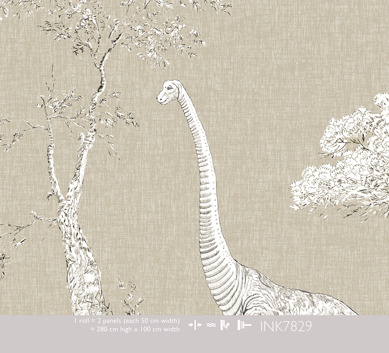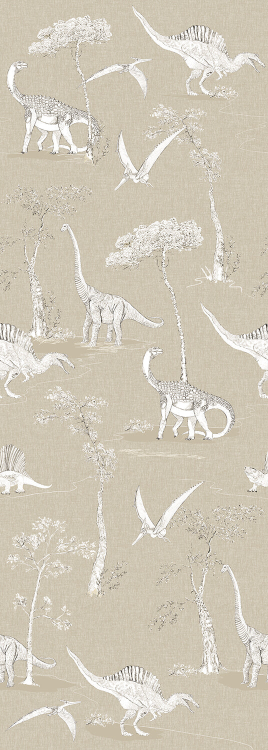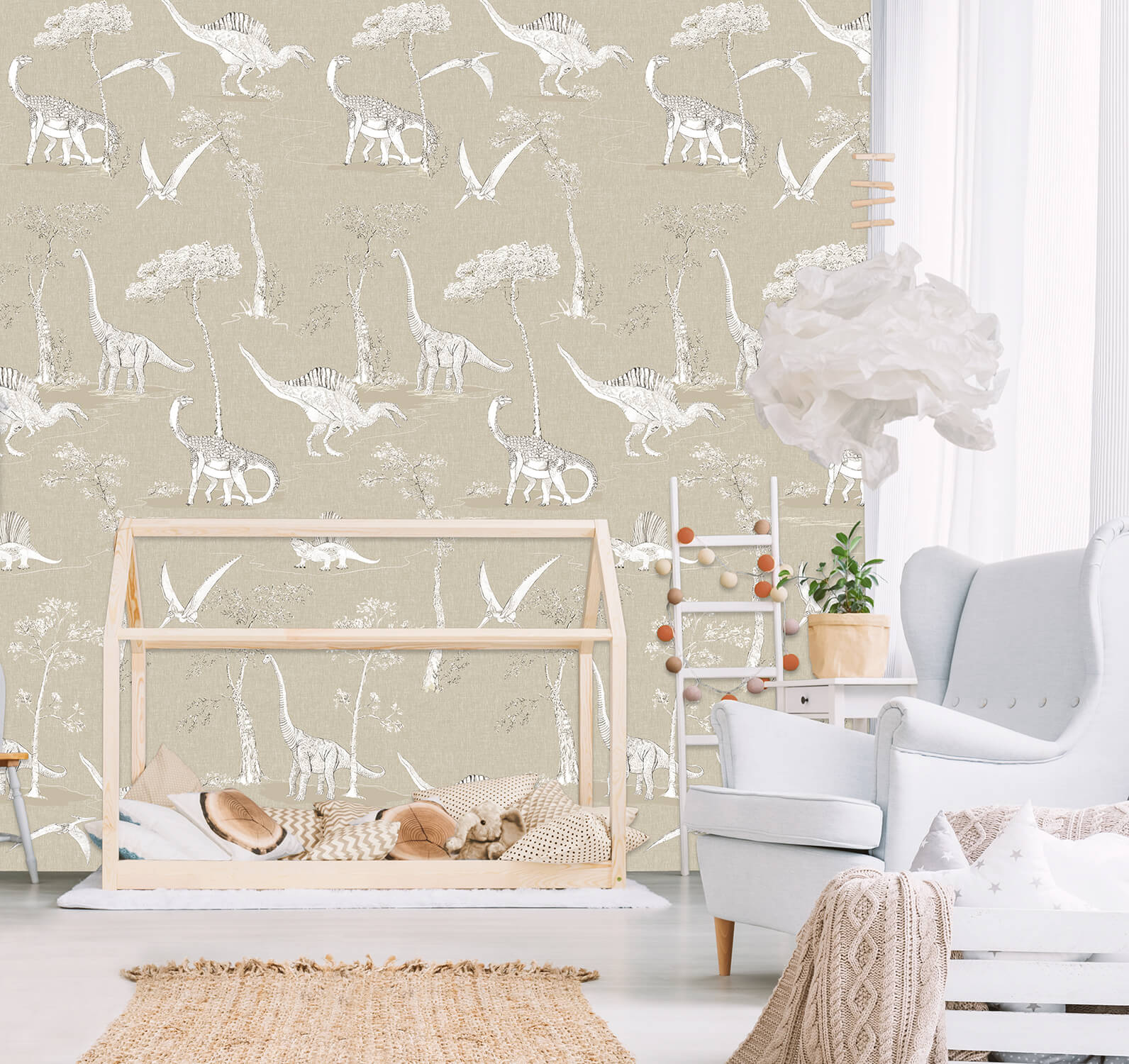 Dit Dino Toile behang in warme zandtinten brengt een vleugje prehistorie naar de kinderkamer op een stijlvolle manier. Dinosaurussen en bomen zijn als fijne witte illustraties afgebeeld op een zachte, zandkleurige achtergrond. Het resultaat is een tijdloos design dat jarenlang mooi blijft en meegroeit met je kind.