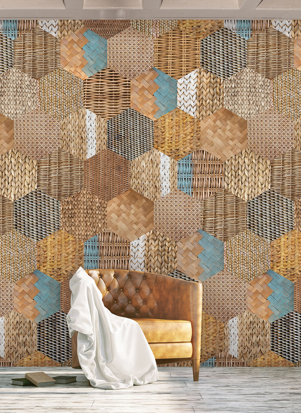 Het Eco Life behang brengt de schoonheid van natuurlijke materialen naar je wand. Hexagonale vlakken gevuld met texturen van gevlochten riet, bamboe, breisels en vlechtwerk creeren een warm, organisch patroon. De aardetinten van bruin, beige en oker worden aangevuld met frisse turquoise accenten die het geheel levendig maken.