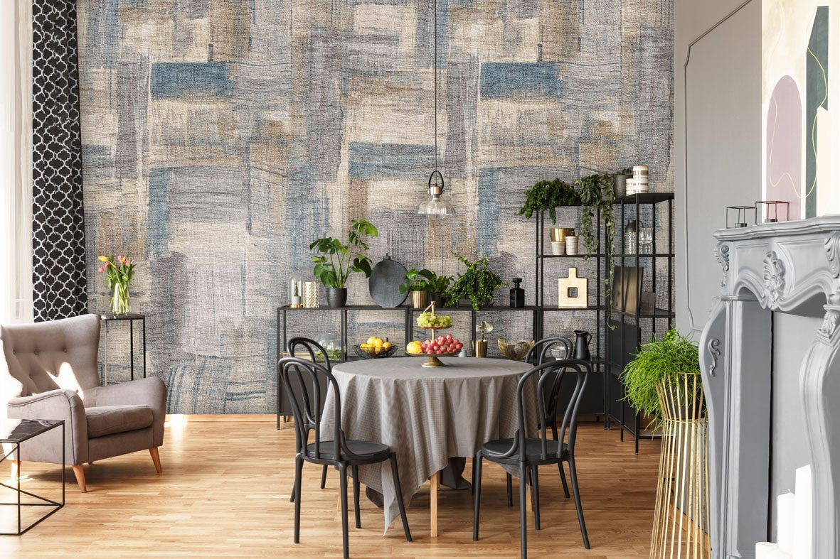 Het Abbey Road behang in blauw en grijs maakt indruk met zijn abstracte verfblokken die doen denken aan een kunstzinnig patchwork. Tinten van staalblauw, grijs, beige en zacht creme wisselen elkaar af op een linnenachtige textuur. Dit design brengt een stoere maar verfijnde sfeer in je eetkamer, woonkamer of thuiskantoor.