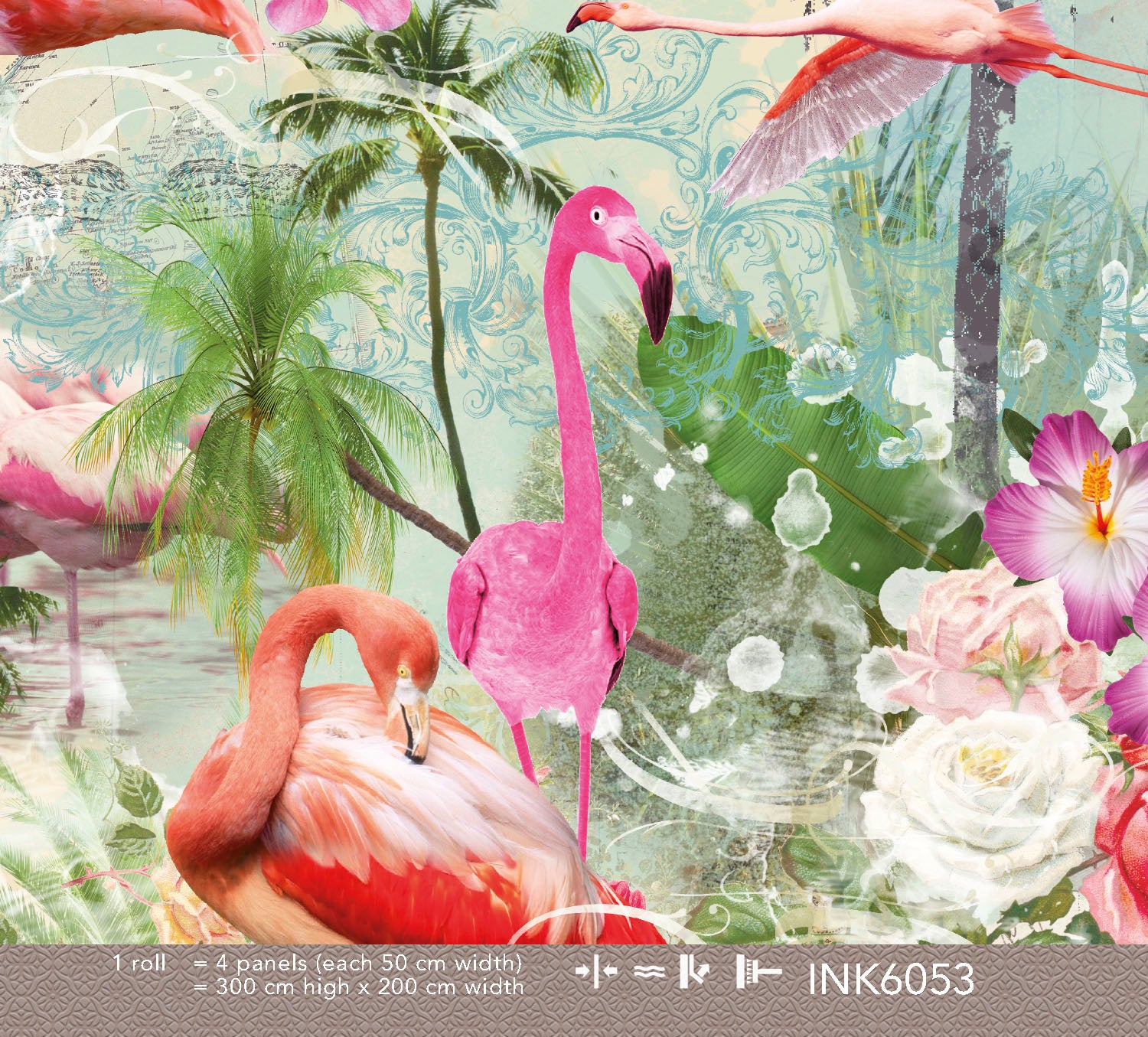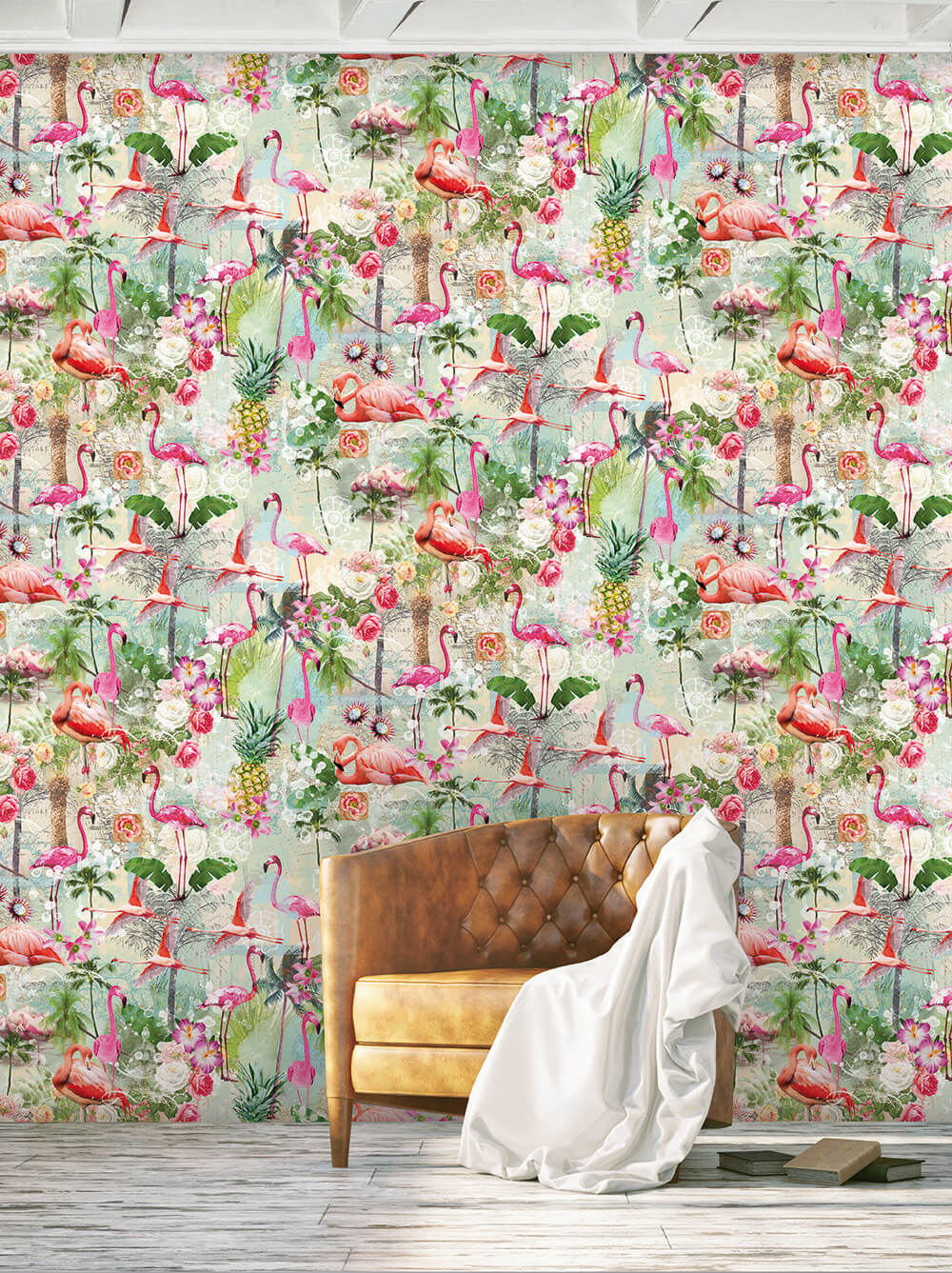 Het Flamingo Summers behang brengt de zomer het hele jaar door naar je interieur. Sierlijke roze flamingo’s, groene palmbomen, tropische bloemen en ananassen vormen een kleurrijk, exotisch patroon op een lichte, licht verweerde achtergrond. Het design straalt warmte en vakantiegevoel uit met een vleugje vintage charme.