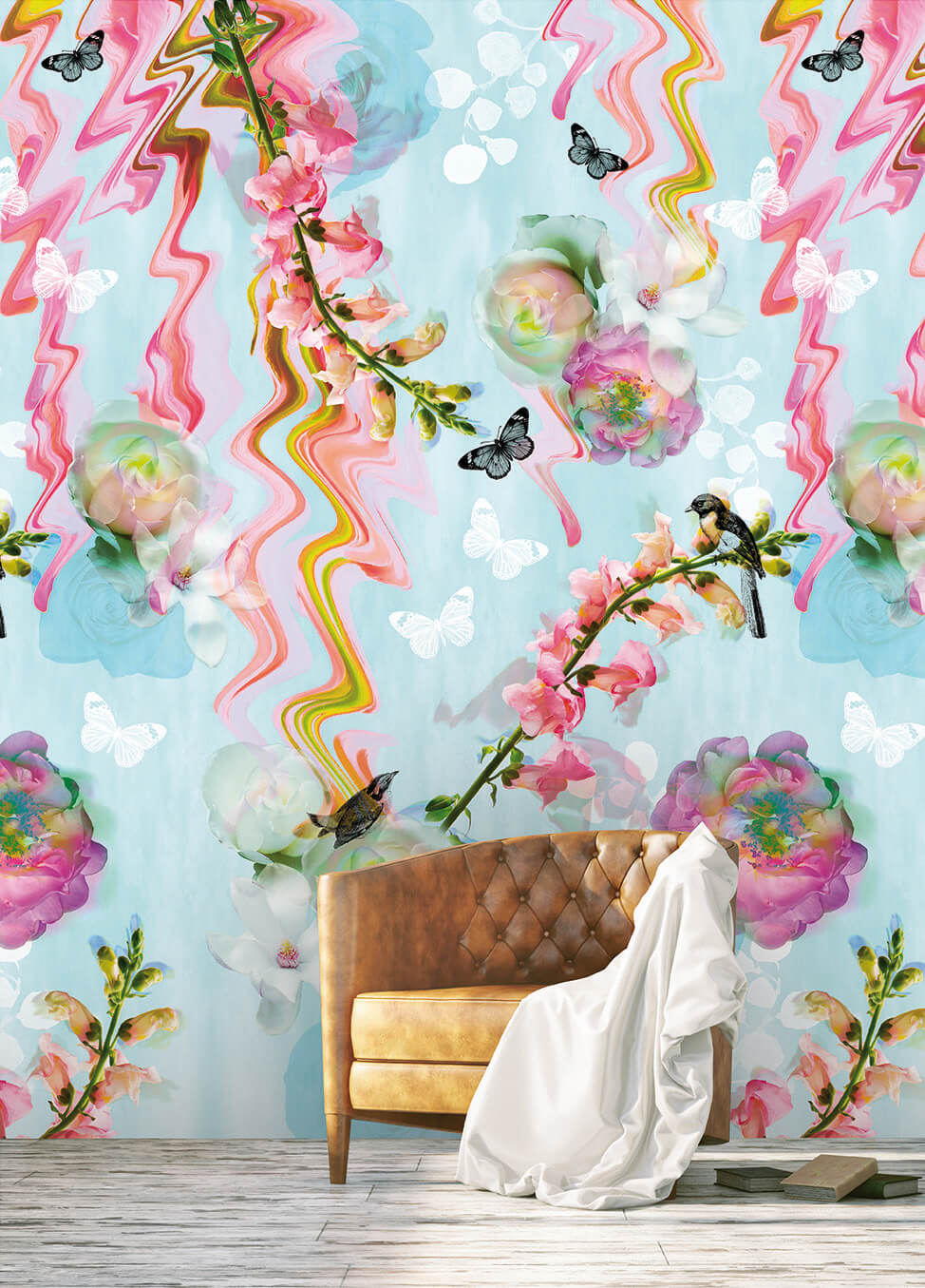 Het Floral Glitch behang combineert klassieke bloemenmotieven met een modern glitch-effect. Roze pioenrozen, vlinders en zangvogels zijn afgebeeld tussen golvende, kleurrijke lijnen op een frisse lichtblauwe achtergrond. Het samenspel van natuur en digitale verstoringen creëert een verrassend, hedendaags design vol beweging en energie.