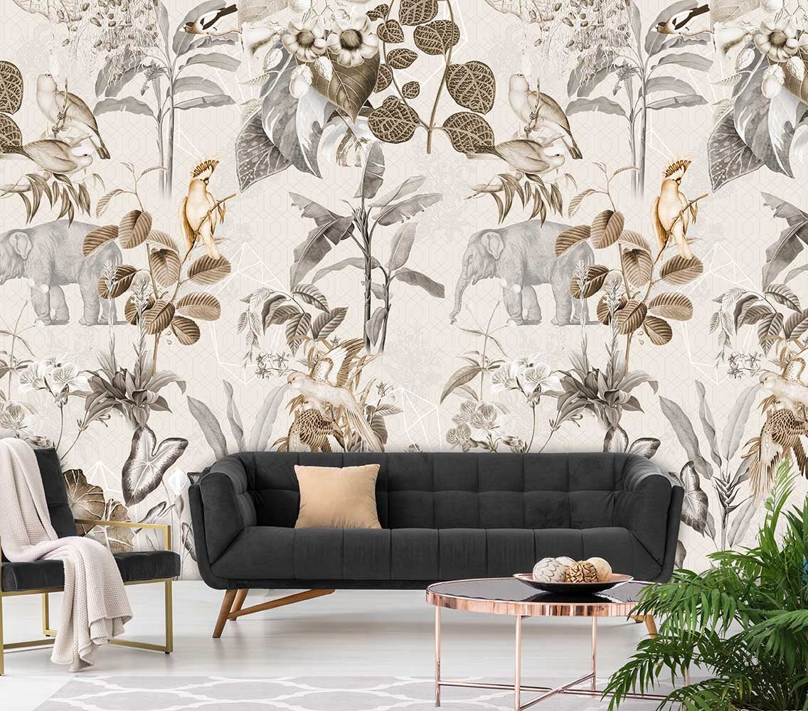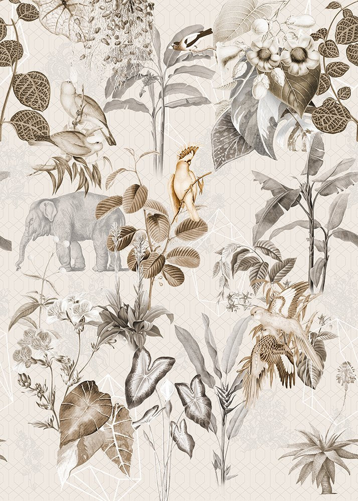 Dit Luang Prabang Neutral behang toont hetzelfde tropische tafereel als zijn kleurrijke variant, maar dan in rustgevende neutrale tinten. Grijzen, bruinen en zachte beigetonen geven de olifant, vogels en tropische planten een elegant en ingetogen karakter. Ideaal voor een woonkamer of slaapkamer waar je sfeer wilt zonder overweldigende kleuren.