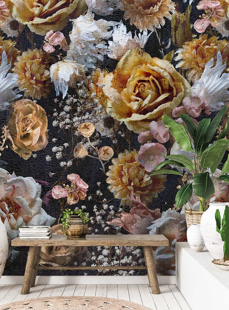 Dit Lush Heritage Dark behang brengt de sfeer van een Oude Meesters schilderij in je huis. Grote gouden rozen en weelderige bloemen schitteren tegen een diep donkere achtergrond, net als een 17e-eeuws bloemstilleven. Het effect is dramatisch, luxueus en tijdloos. Perfect als statement wand in je woonkamer, eetkamer of slaapkamer.