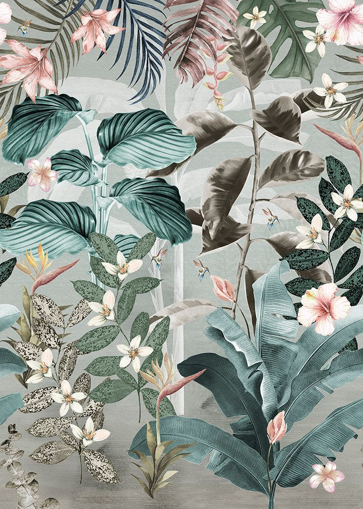 Dit Magufuli Petrol behang toont hetzelfde tropische tafereel als de Green-variant, maar dan in koelere petrolblauwe en grijsgroene tinten. Grote bananenbladeren, hibiscusbloemen en orchideeën creëren een verfijnd, rustig tropisch beeld. De gedempte kleuren maken het geschikt voor een woonkamer, slaapkamer of thuiswerkplek waar je sfeer wilt zonder visuele drukte.