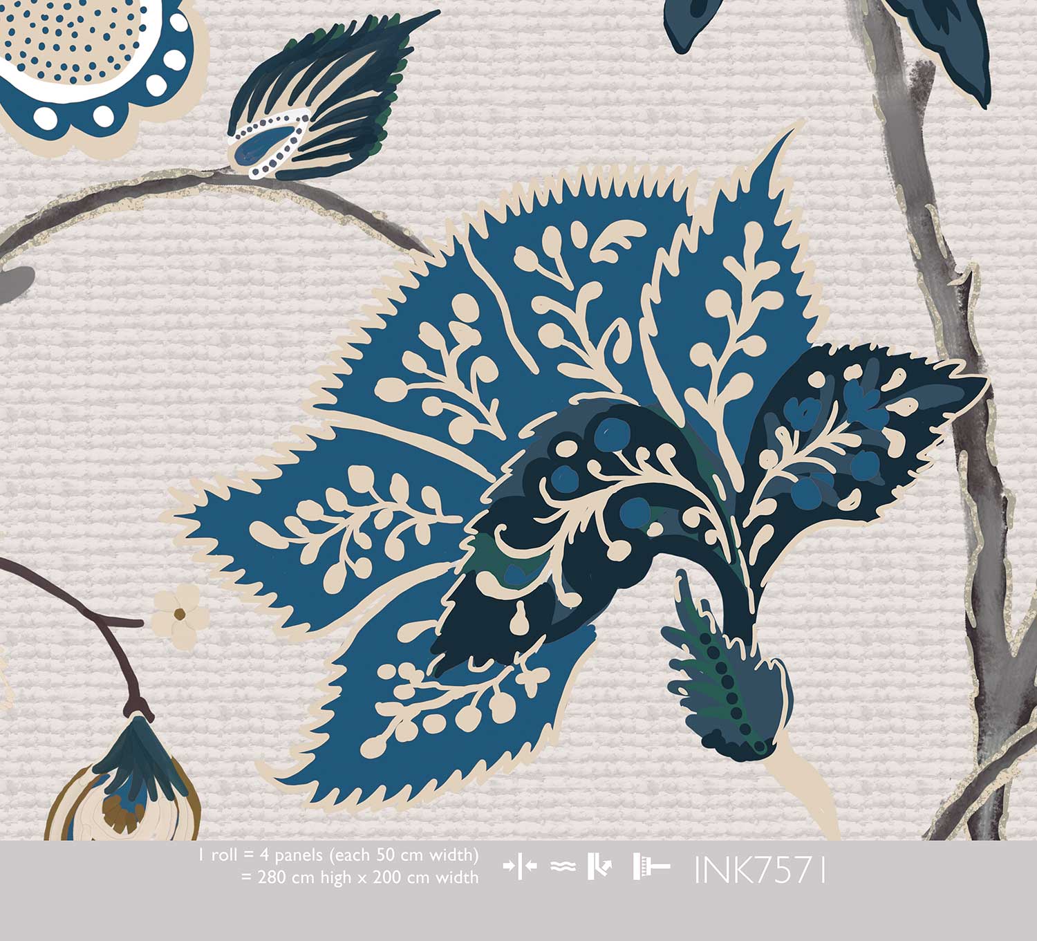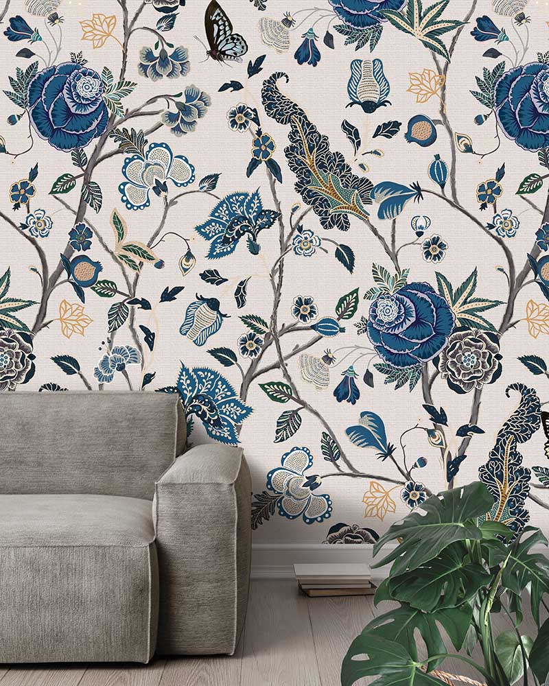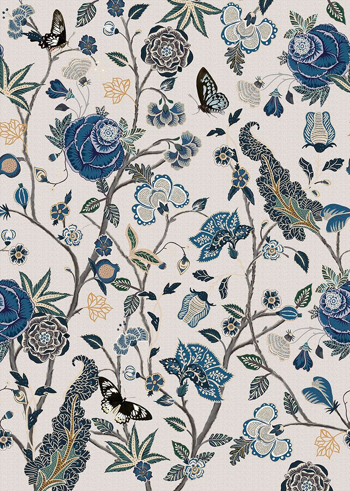 Dit Pomegranate Blue behang is een prachtig voorbeeld van chinoiserie. Sierlijke ranken vol blauwe bloemen, vlinders en gedetailleerde bladeren kronkelen over een lichte achtergrond. De blauwtinten in combinatie met groene accenten creëeren een frisse, elegante sfeer die perfect past bij een woonkamer, slaapkamer of studeerkamer.