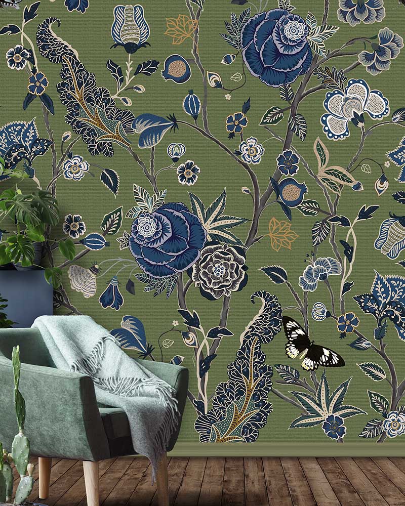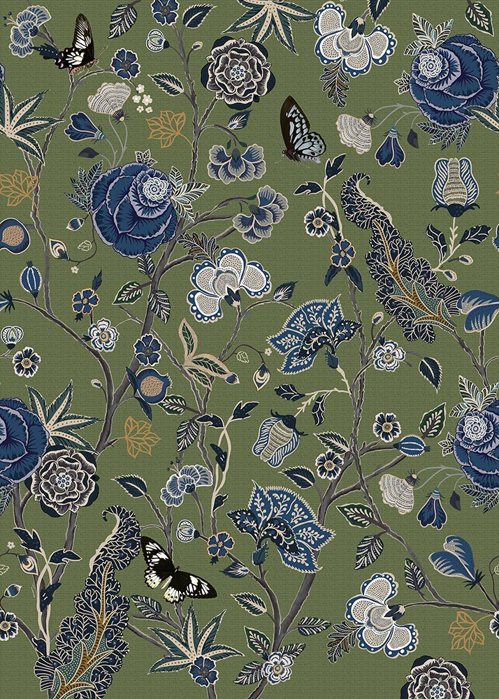 Dit Pomegranate Moss behang toont hetzelfde sierlijke chinoiserie-patroon als de blauwe variant, maar dan op een rijke mosgroene achtergrond. Blauwe bloemen, vlinders en gedetailleerde ranken komen prachtig tot hun recht tegen het diepe groen. Het resultaat is een weelderige, botanische sfeer die je woonkamer of eetkamer direct transformeert.