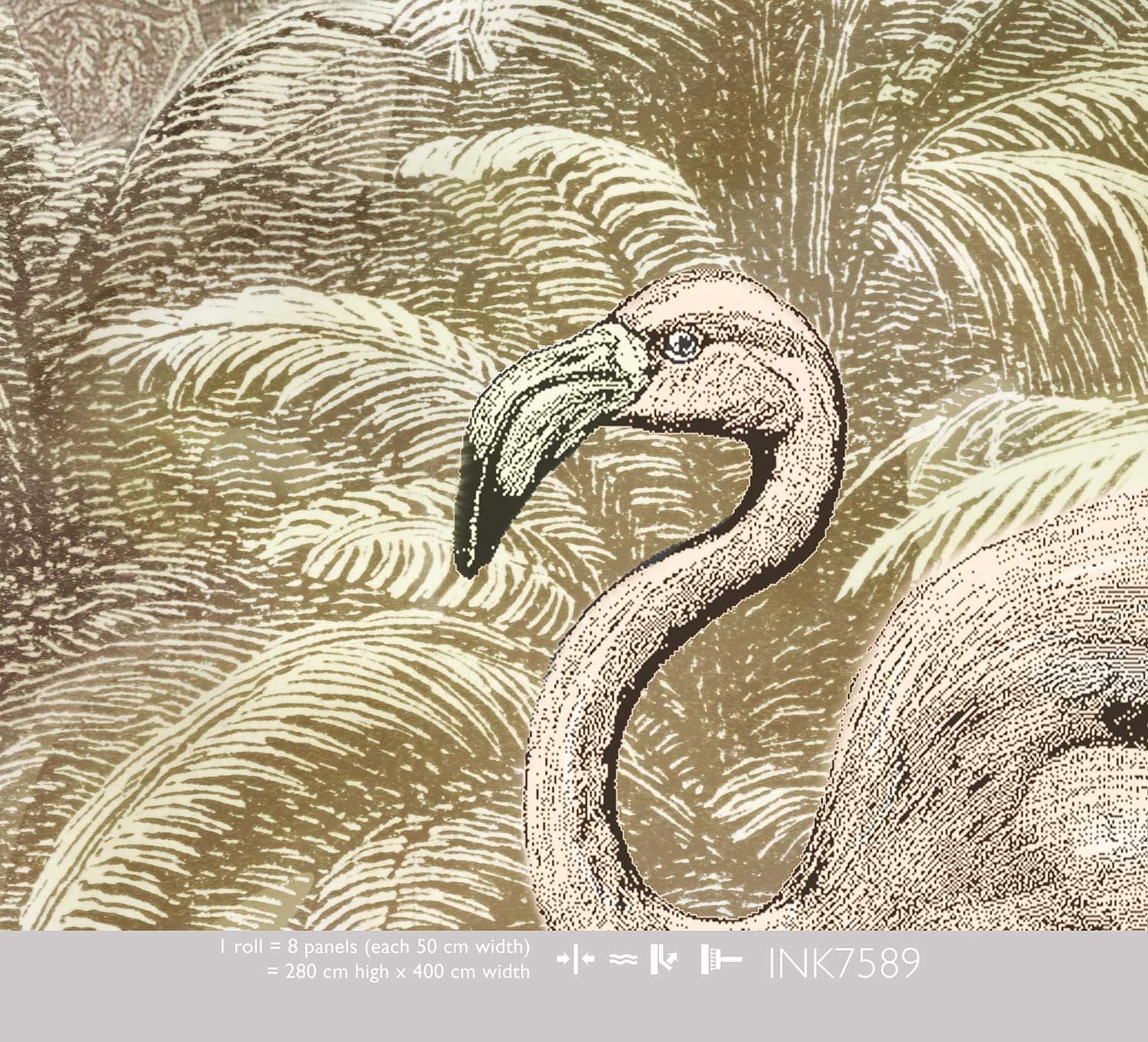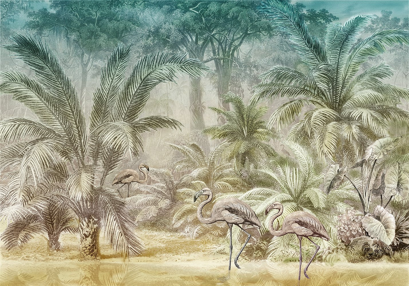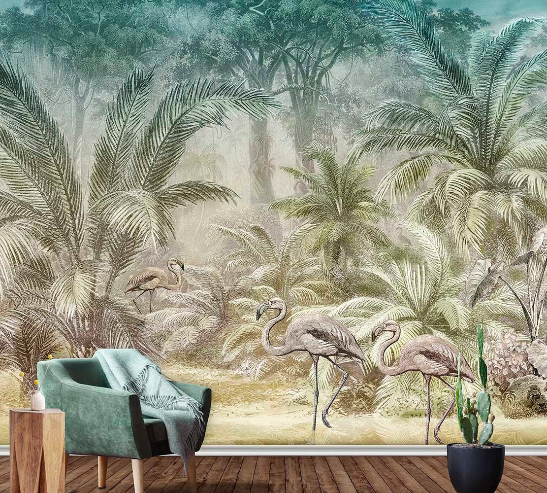 Stap een tropische avond binnen met dit Pondicherry Evening behang. Sierlijke flamingo’s wandelen tussen palmbomen en weelderig groen, terwijl warme avondtinten van groen en goud de sfeer bepalen. De mistige, dromerige achtergrond geeft het geheel een mysterieuze diepte die perfect is voor een woonkamer of slaapkamer.