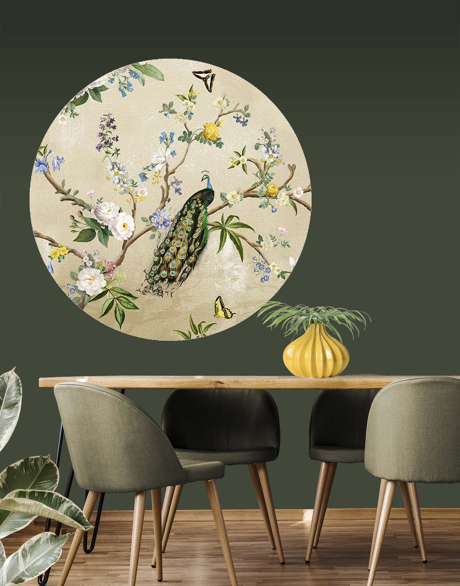 Dit Secret Garden wandcirkel behang vangt de magie van een geheime tuin in een prachtige ronde vorm. Een elegante pauw, vlinders en bloeiende takken op een warme zandkleurige achtergrond vormen een sprookjesachtig accent voor je muur. Ideaal boven een eettafel, in een hal of als blikvanger in je woonkamer.