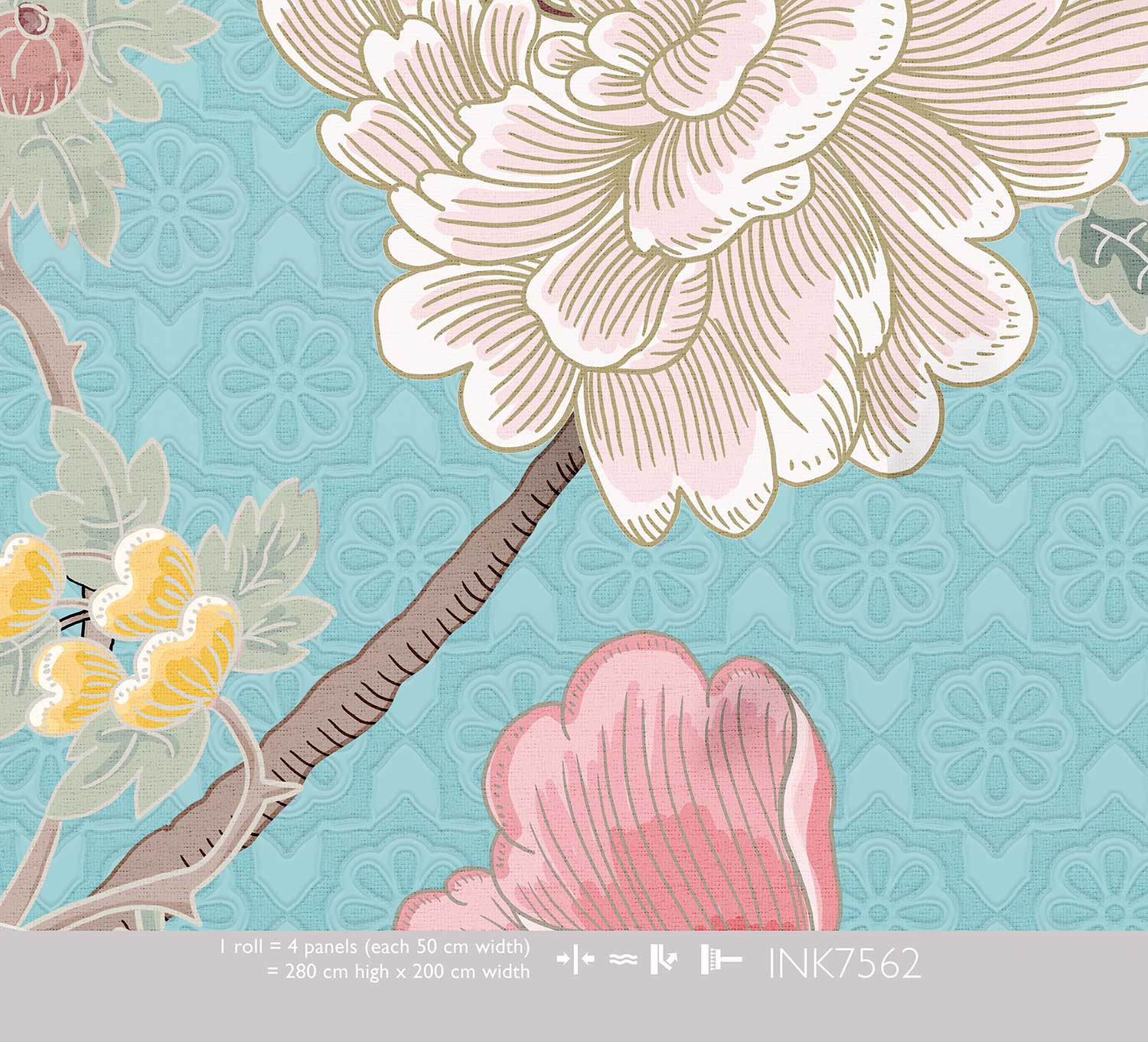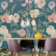 Tea Garden Afternoon behang met pioenrozen op blauw