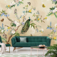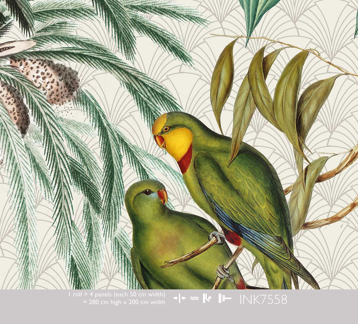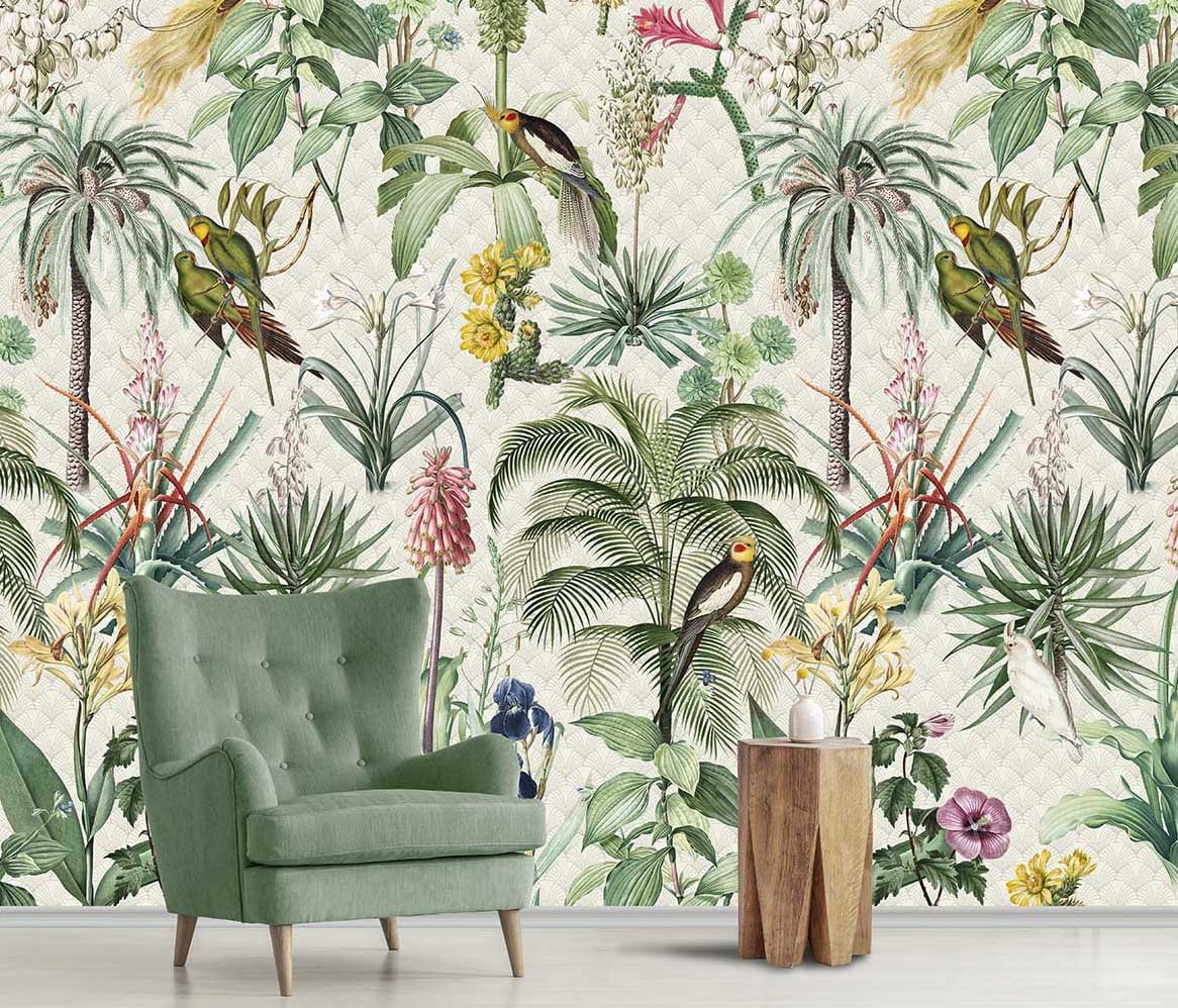 Dit Tropical Morning behang brengt de frisse energie van een tropische ochtend in je interieur. Palmbomen, exotische planten, kleurrijke papegaaien en bloeiende bloemen sieren een lichte achtergrond met subtiel patroon. Het ontwerp is levendig en vol detail, ideaal voor een woonkamer, eetkamer of hal waar je een statement wilt maken.