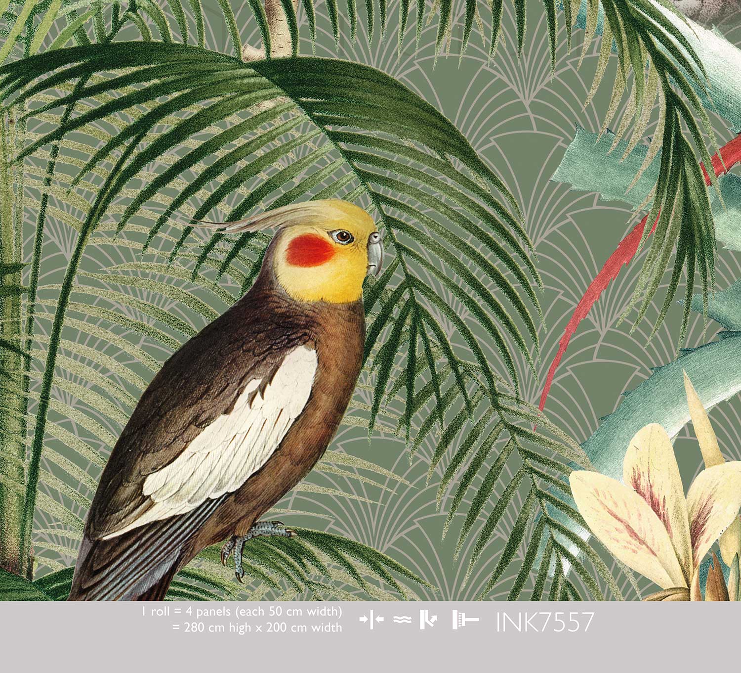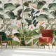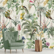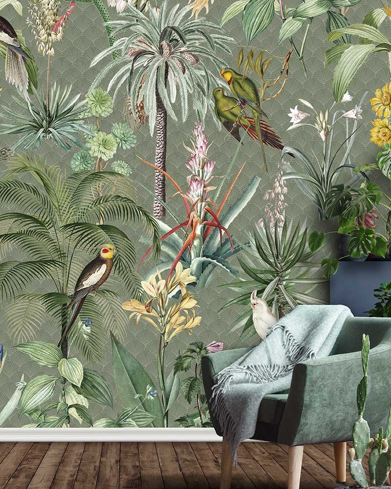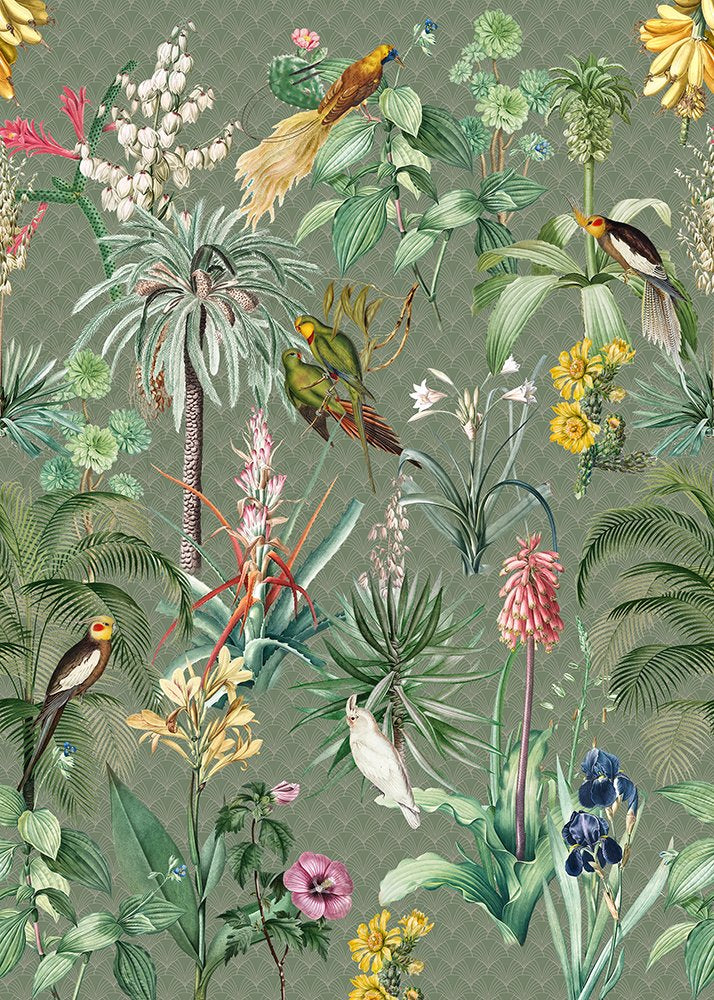 Dit Tropical Winter behang toont hetzelfde weelderige tropische tafereel als Tropical Morning, maar dan in een gedempter kleurenpalet. Palmen, exotische planten en papegaaien zijn afgebeeld op een grijsgroene achtergrond met subtiel patroon. Het resultaat is een ingetogen, volwassen versie van de jungle die perfect past bij een woonkamer of werkkamer.