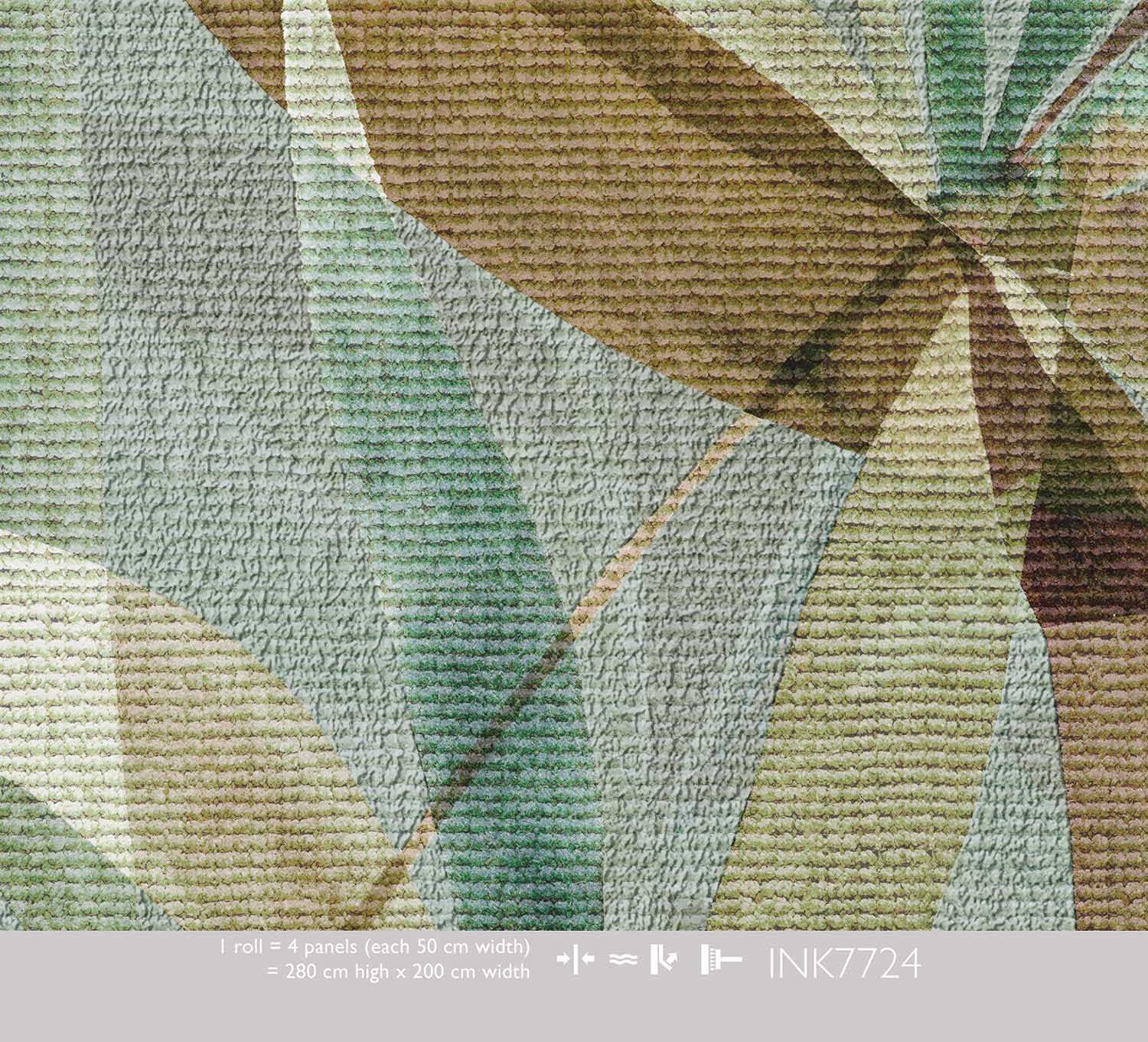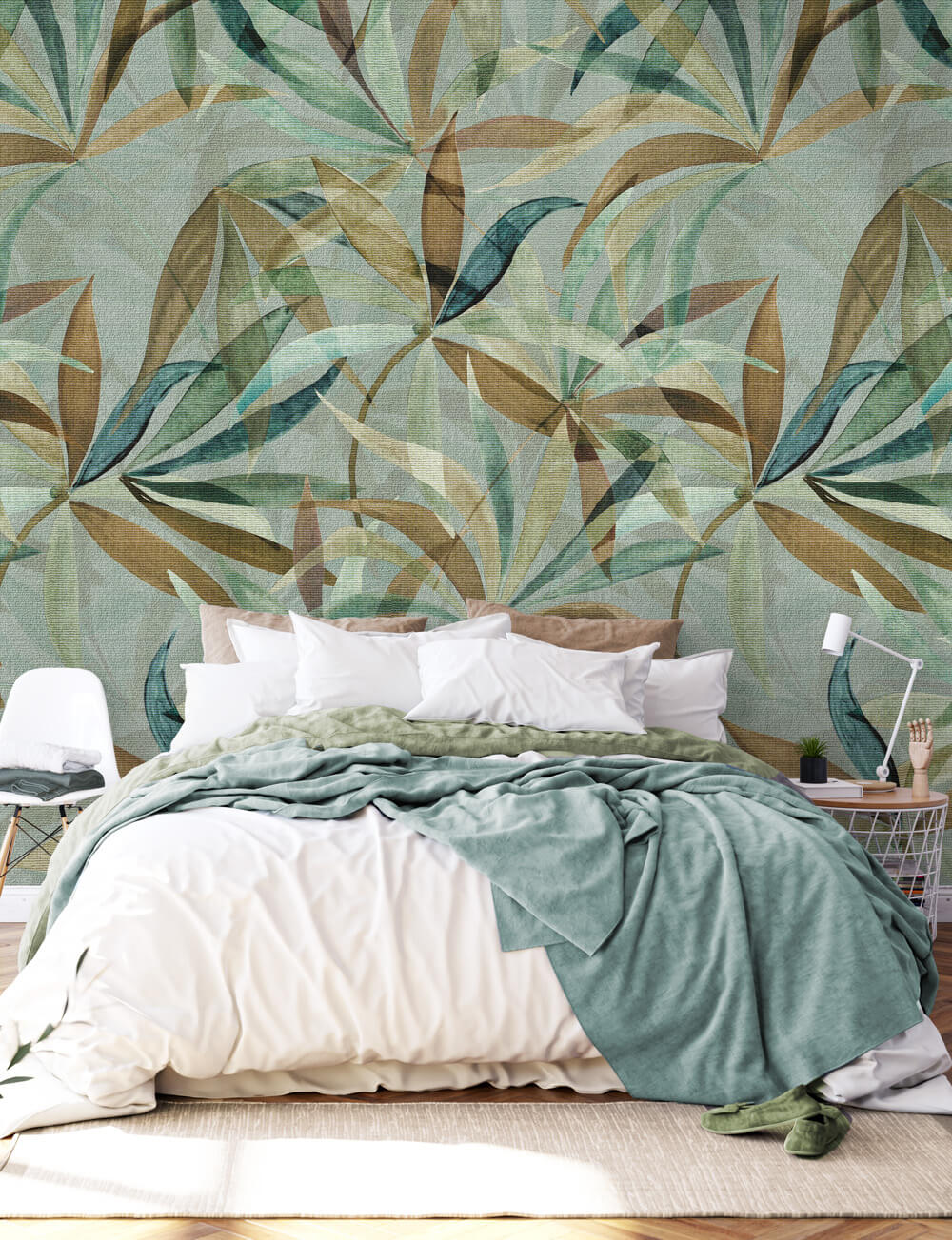Het Flowing Leaves Multi behang vangt de elegante beweging van tropische bladeren in een prachtig kleurenspel. Langwerpige bladeren in groen, goud, teal en bruin overlappen en draaien door elkaar heen, waardoor een vloeiend, dynamisch patroon ontstaat. De zachte, getextureerde achtergrond in groenblauwe tinten geeft het ontwerp diepte en warmte.