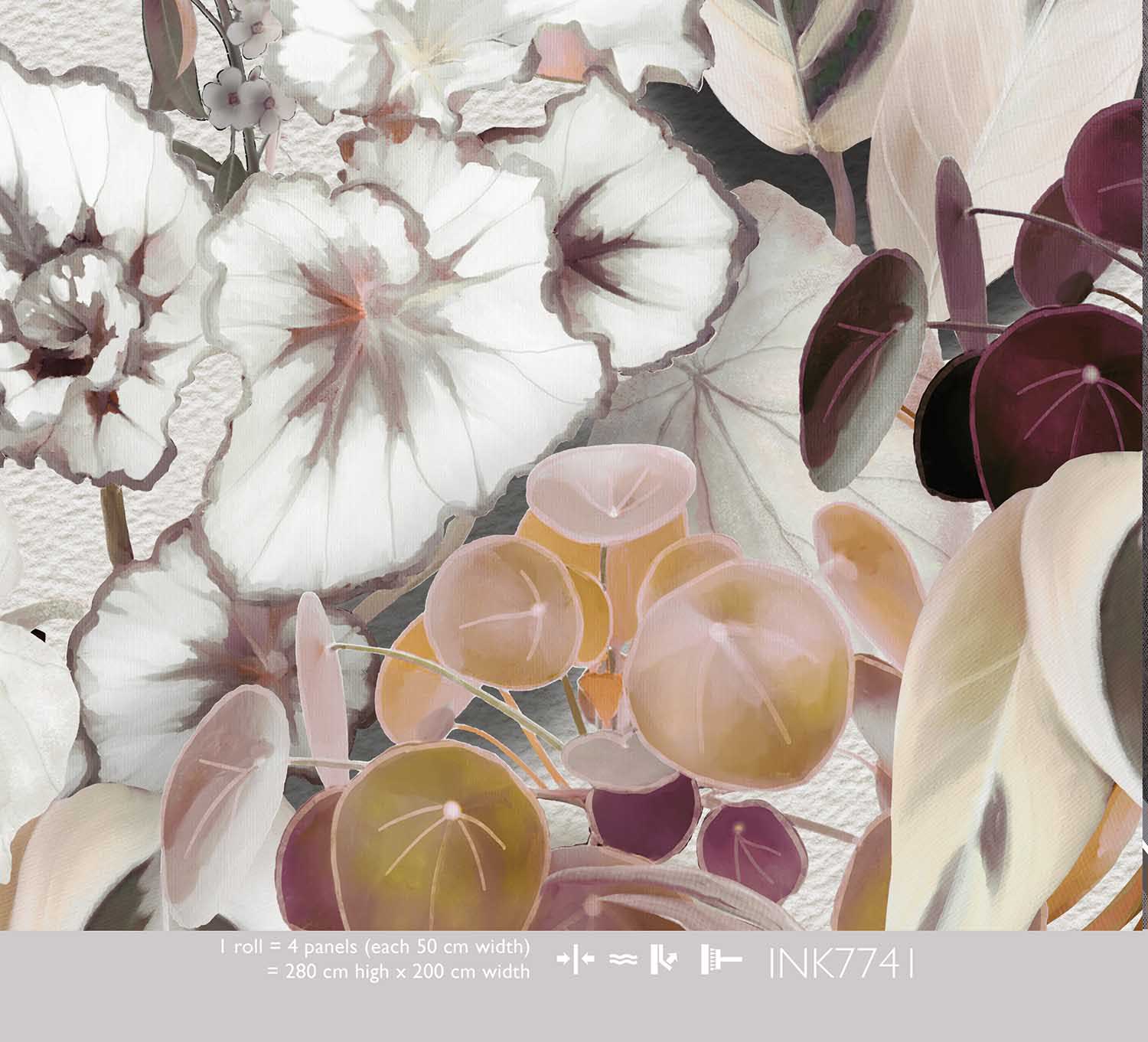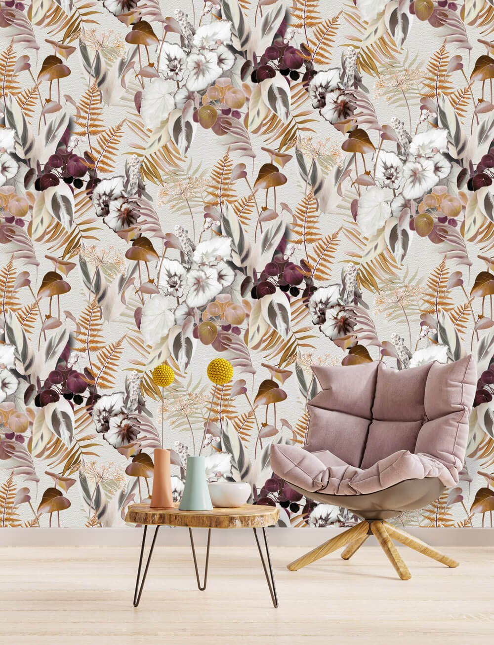 Het Forest Dream Classic behang neemt je mee naar een herfstbos vol schoonheid. Gouden varenbladen, sierlijke paddenstoelen, wilde bloemen en exotische bladeren zijn gecomponeerd in warme tinten van brons, okergeel, bordeaux en grijs. De lichte achtergrond laat deze herfstkleuren prachtig uitkomen en geeft het ontwerp een klassieke, verfijnde uitstraling.