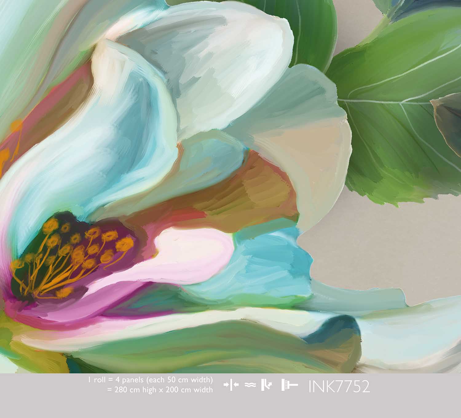Het Gouache Floral Neutral behang combineert elegantie met natuur. Grote, in gouache-stijl geschilderde bloemen in zachte tinten van groen, blauw, roze en lila worden omringd door sierlijke eucalyptusbladeren. De neutrale grijsbeige achtergrond laat de bloemen prachtig uitkomen zonder het geheel te druk te maken.