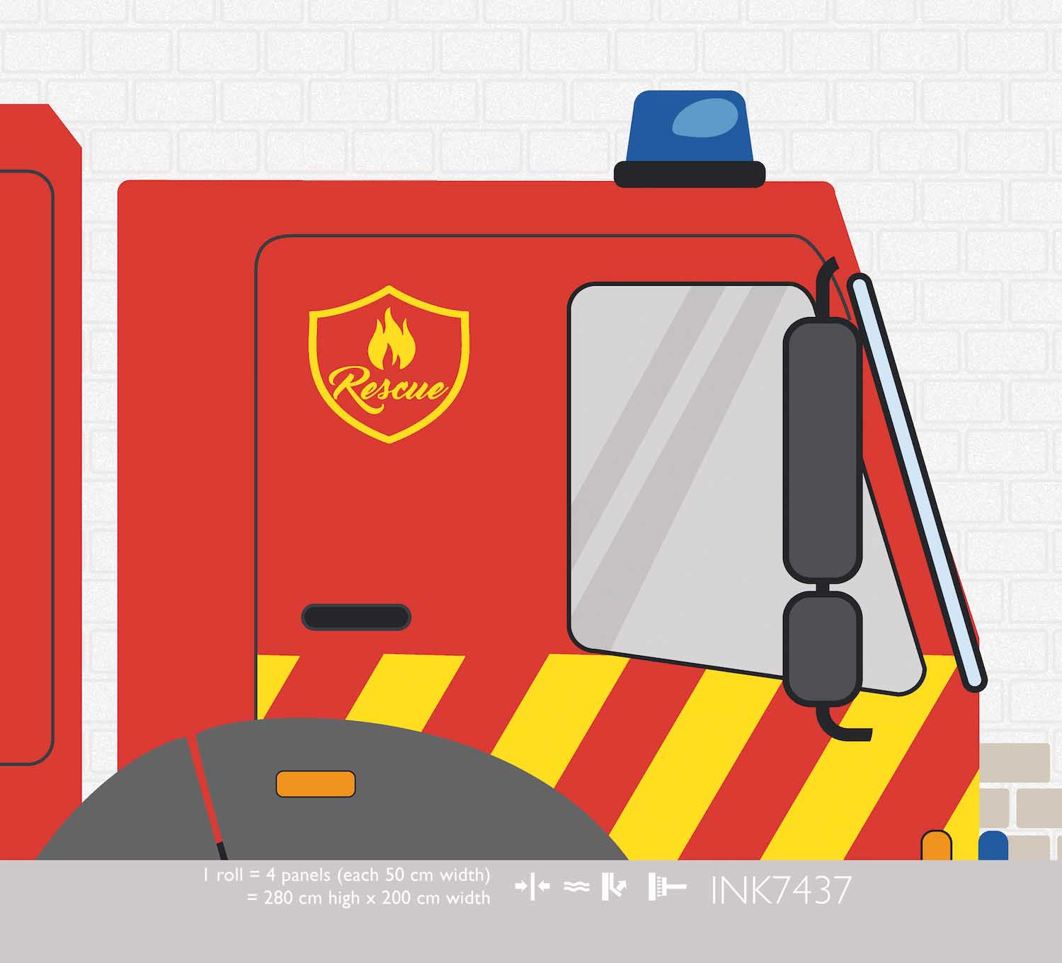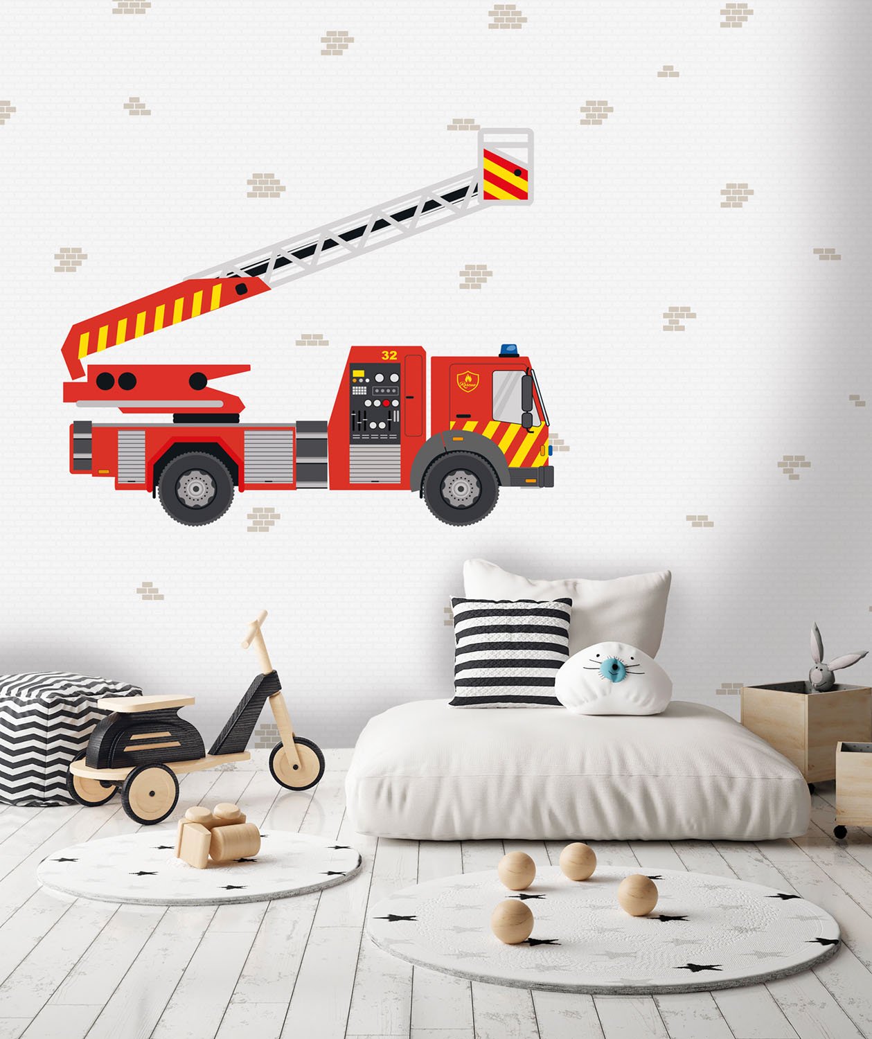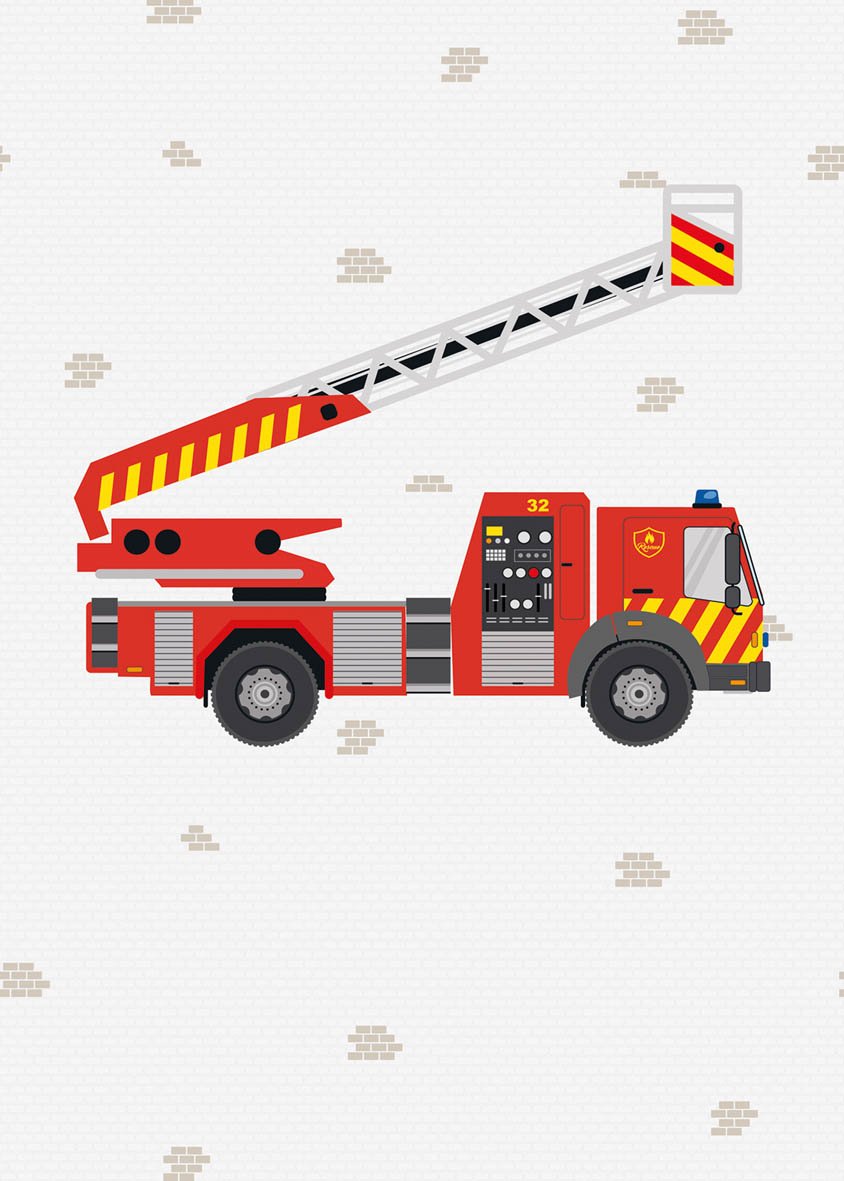 Tatuu tatuu! Dit indrukwekkende behang met een grote, gedetailleerde brandweerwagen is een droom voor elke kleine brandweerman of -vrouw. De helderrode brandweerauto met uitschuifbare ladder staat vol in actie op een lichte achtergrond met subtiele baksteenmotieven. Een echte blikvanger die de kinderkamer omtovert tot een brandweerkazerne.