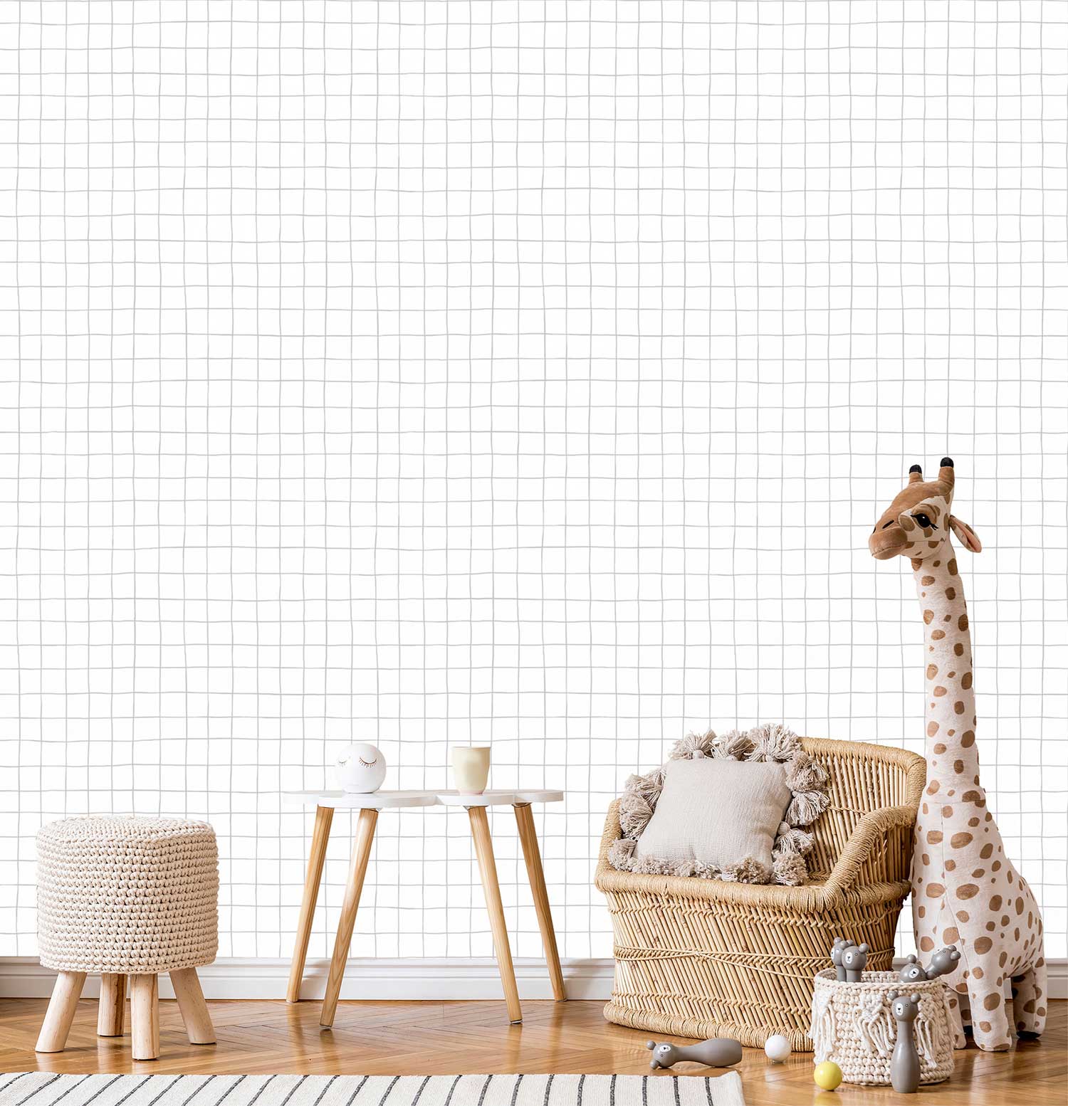 Dit subtiele gridpatroon in zacht grijs op wit brengt rust en structuur in de babykamer of kinderkamer. De fijne, handgetekende lijnen zorgen voor een scandinavisch en minimalistisch gevoel. Een ideale keuze als je op zoek bent naar behang dat jarenlang meegaat en met elk interieur combineert.