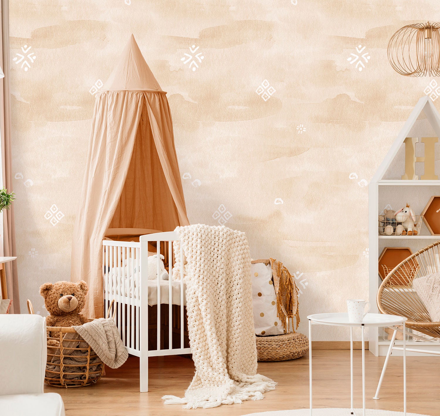 Dit sfeervolle uni behang in warme zandtinten met een subtiele aquarelstructuur vormt de perfecte achtergrond voor de babykamer of kinderkamer. De zachte waterverftextuur en kleine witte motiefjes geven het effen behang net dat beetje extra. Combineer het met het Into The Wild-design voor een compleet, samenhangend geheel.