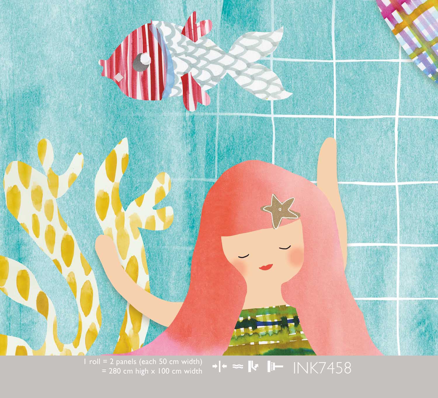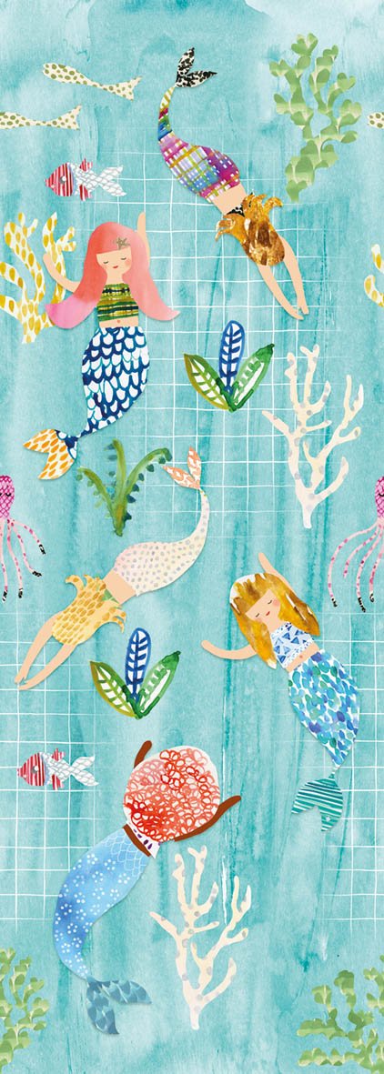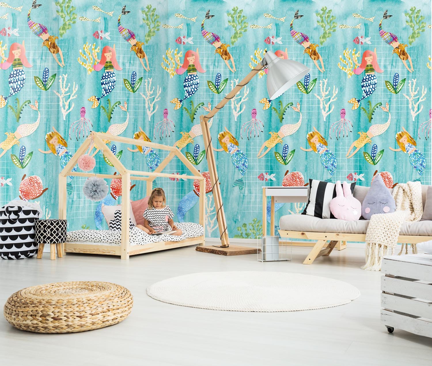 Duik in een kleurrijke onderwaterwereld met dit vrolijke zeemeerminnen behang. Speelse zeemeerminnen zwemmen tussen koraal, vissen en zeeplanten op een levendige turquoise achtergrond. De rijke kleuren en gedetailleerde illustraties maken dit behang tot een feest voor de ogen in elke kinderkamer.
