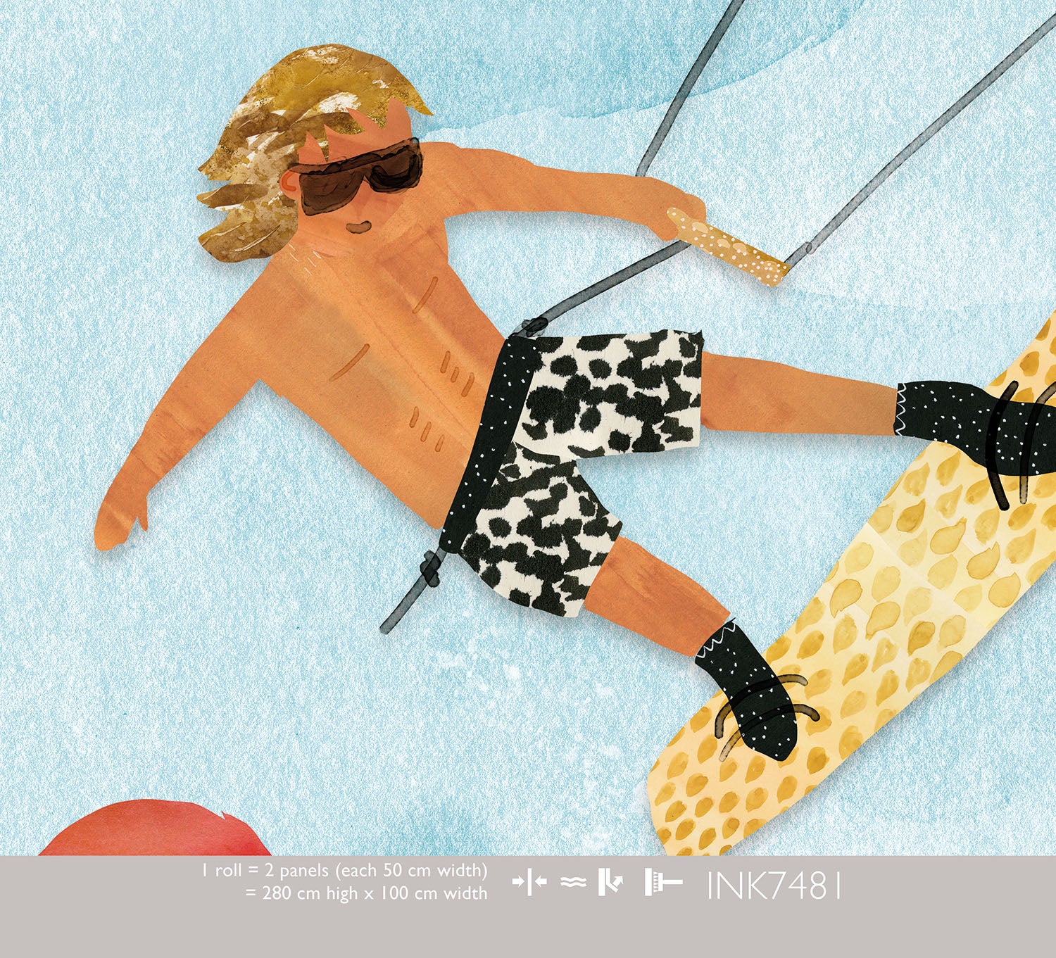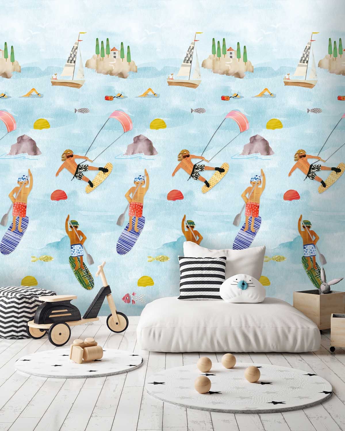 Breng de zomer naar de kinderkamer met dit levendige vliesbehang vol surfers, kitesurfers en zeilboten. De aquarel-achtige illustraties op een fris lichtblauwe achtergrond geven de kamer direct een vrolijk en avontuurlijk karakter. Dit behang is een echte blikvanger voor stoere kinderen die van zee en strand houden.