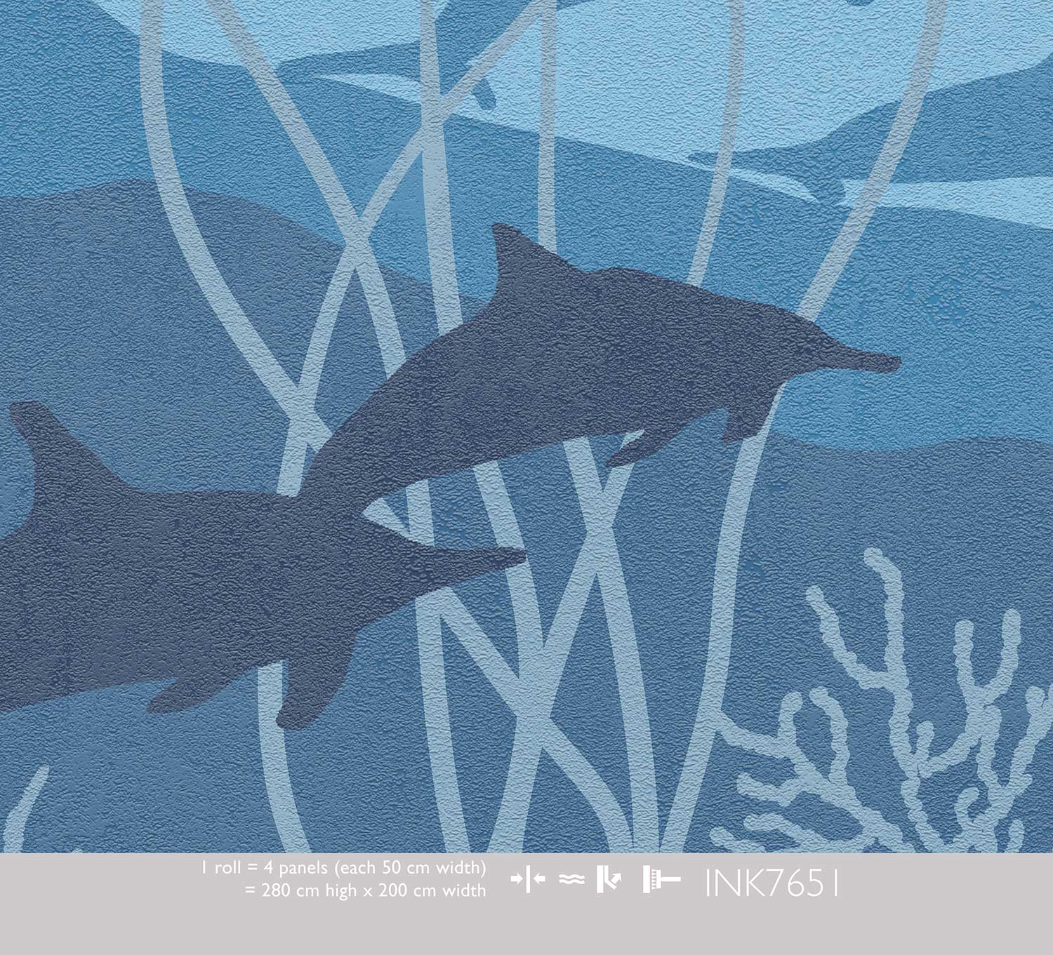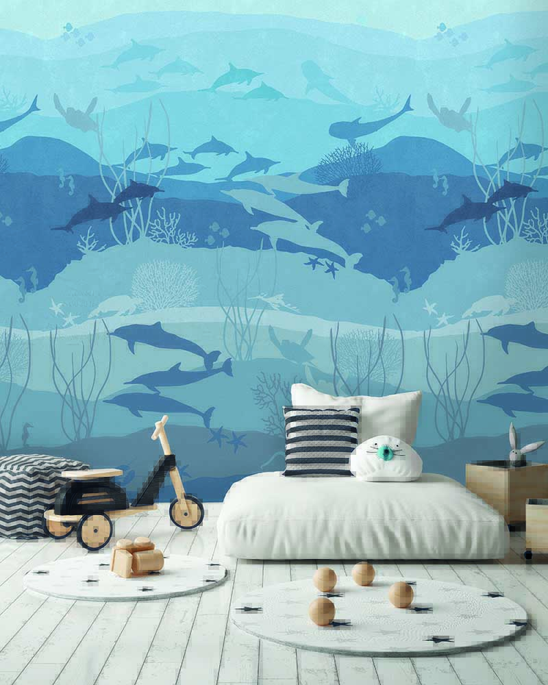 Dit Blue Eden kinderbehang brengt de diepte van de oceaan naar de kinderkamer. Silhouetten van dolfijnen, zeesterren, koraal en zeeplanten zwemmen door prachtige lagen van blauw, van lichtaqua tot diepblauw. Het grafische ontwerp met kleurverloop creëert een rustgevende, serene sfeer.