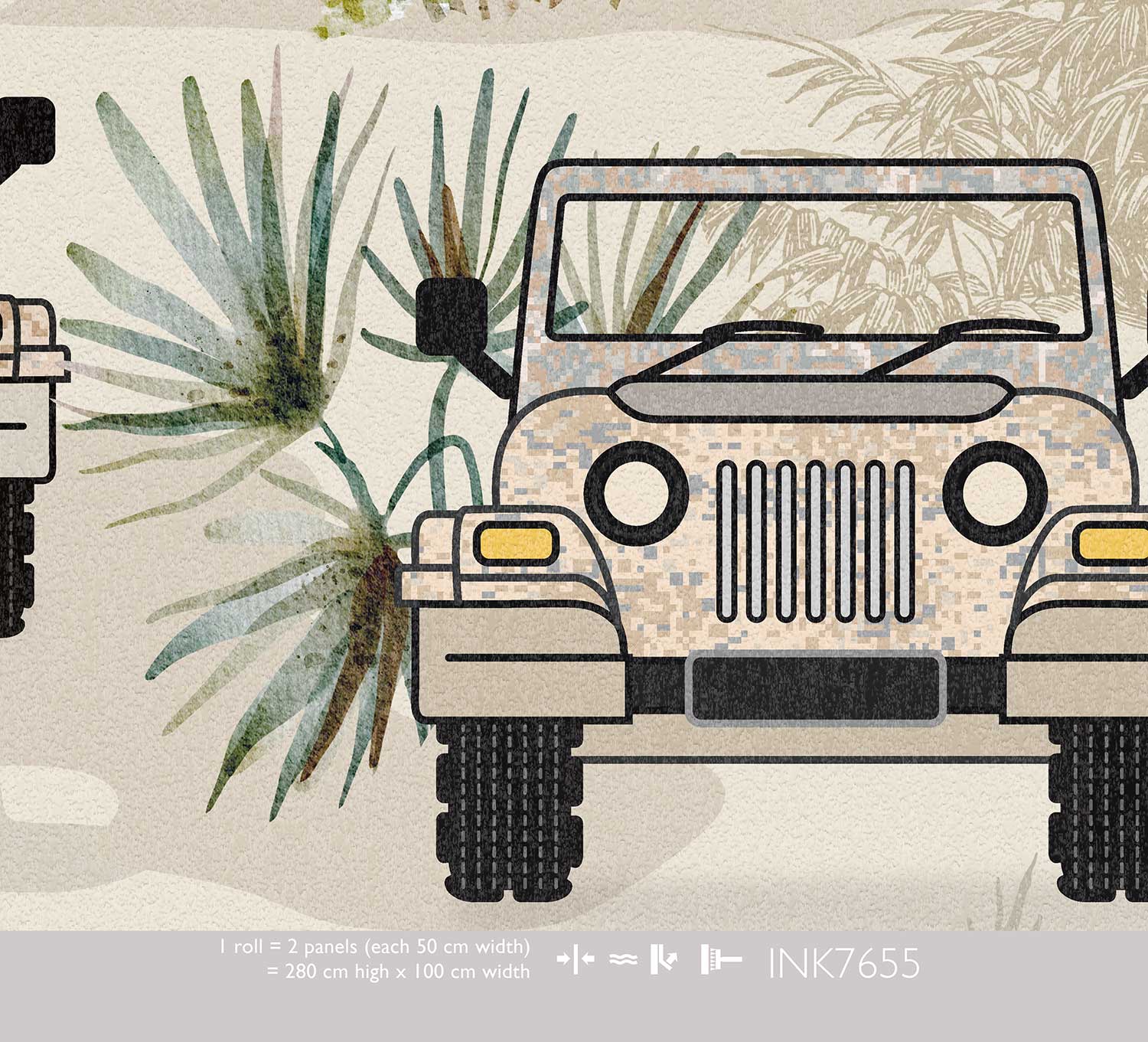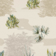 Dit Bush Drive behangontwerp toont een sereen landschap met bamboe, palmen, agaves en tropische struiken in zachte zand- en groentinten. De rustgevende botanische illustraties creëren een natuurlijke sfeer die perfect past als basis in de kinderkamer of babykamer.