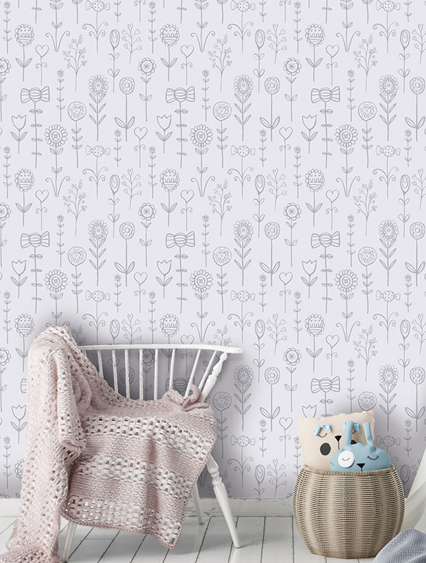 Dit vertederende bloemenbehang brengt een romantische sfeer in de kinderkamer. Lieve getekende bloemen, hartjes, snoepjes en strikjes in grijs op een zacht lila achtergrond creeren een speels en dromerig patroon. Ideaal voor de babykamer of meisjeskamer.