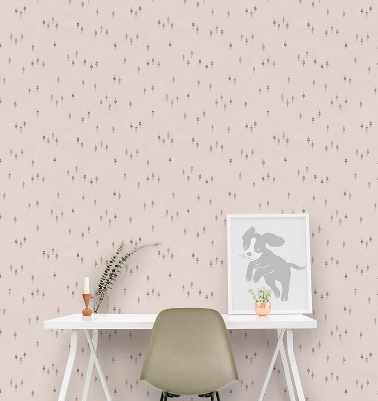 Dit zachte popjesbehang op een poederroze achtergrond is ideaal voor een lieve meisjeskamer of babykamer. De kleine figuurtjes in warme, zachte tinten vormen een subtiel patroon dat rust en gezelligheid uitstraalt. Een tijdloos ontwerp dat meegroeit met je kind.