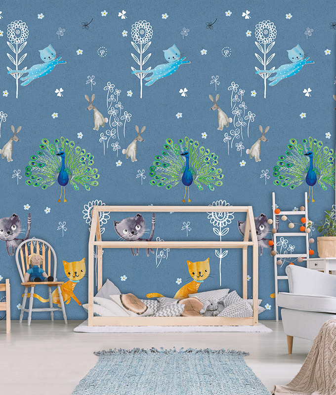 Neem je kleintje mee naar een betoverend nachtelijk landschap met dit prachtige fotobehang. Springende katten, sierlijke pauwen en speelse konijntjes omringd door witte bloemen op een diepblauwe achtergrond creeren een magische sfeer in de kinderkamer. De rijke blauwe kleur maakt het ook geschikt als accentwand.