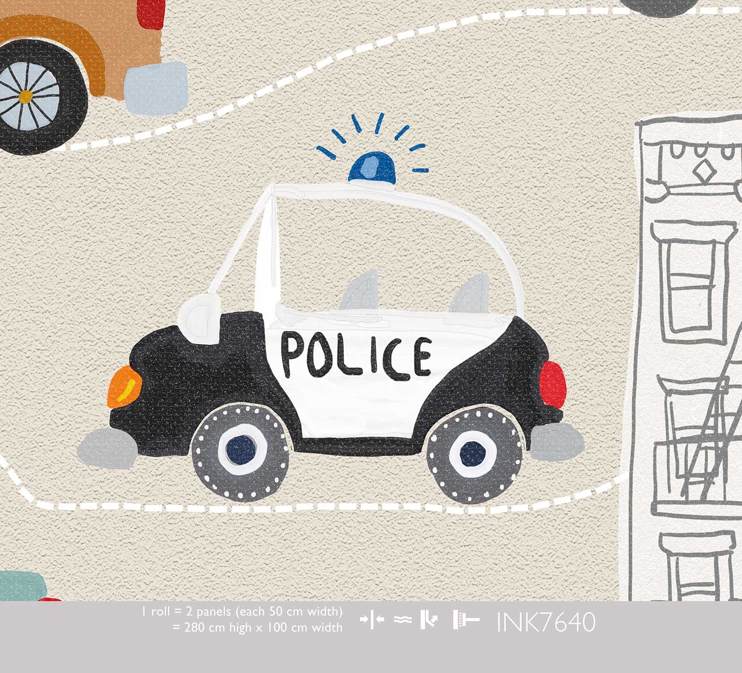 Dit Traffic Color kinderbehang brengt een bruisend straatbeeld naar de kinderkamer. Kleurrijke auto’s, taxi’s, politiewagens, helikopters en gebouwen vormen een vrolijk verkeerspatroon met stippellijnen als wegen. De levendige kleuren in rood, geel, blauw en groen maken het een echte blikvanger.