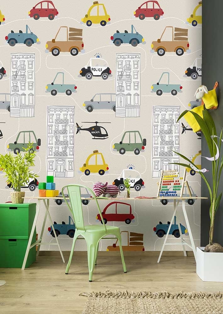 Dit vliesbehang is op maat verkrijgbaar en wordt in Nederland geproduceerd. Het speelse ontwerp prikkelt de fantasie en is ideaal voor een kinderkamer of speelhoek van kleine autofans.
