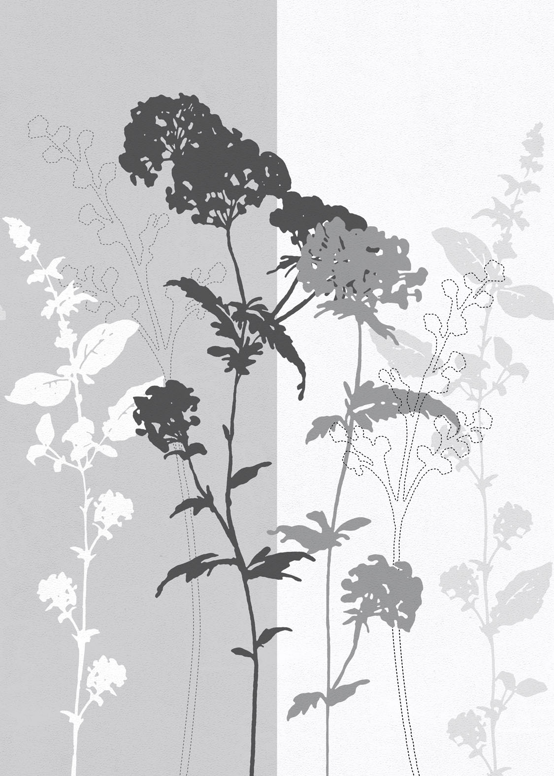 Breng de rust van een bloemenveld in je huis met dit subtiele vliesbehang. Silhouetten van wilde bloemen, grassen en kruiden in verschillende grijstinten staan afgetekend tegen een tweekleurige achtergrond van licht en donkergrijs. Het design ademt rust en eenvoud. Perfect voor een slaapkamer, woonkamer of rustige leeshoek.
