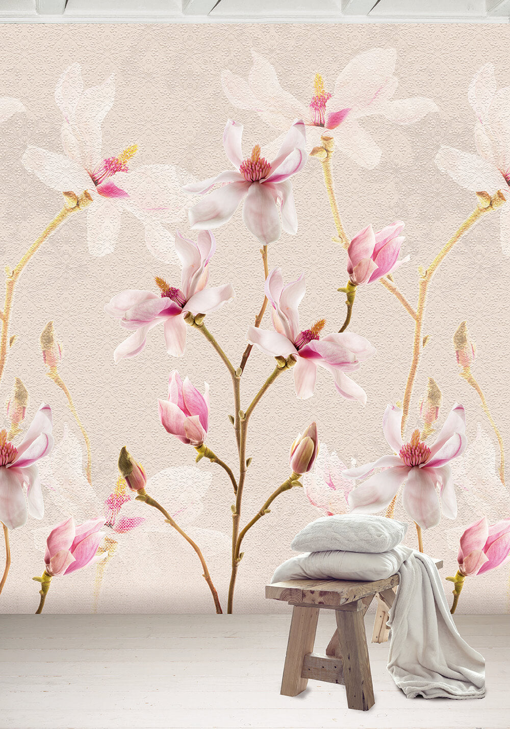 Het Magnolia behang brengt de tijdloze schoonheid van magnoliabloesem naar je interieur. Grote, realistische magnolia’s in zachte tinten van roze, wit en fuchsia staan elegant afgebeeld op een lichte, subtiel gestructureerde achtergrond. De fijne details van bloemblaadjes en knoppen geven het design een serene, natuurlijke uitstraling.