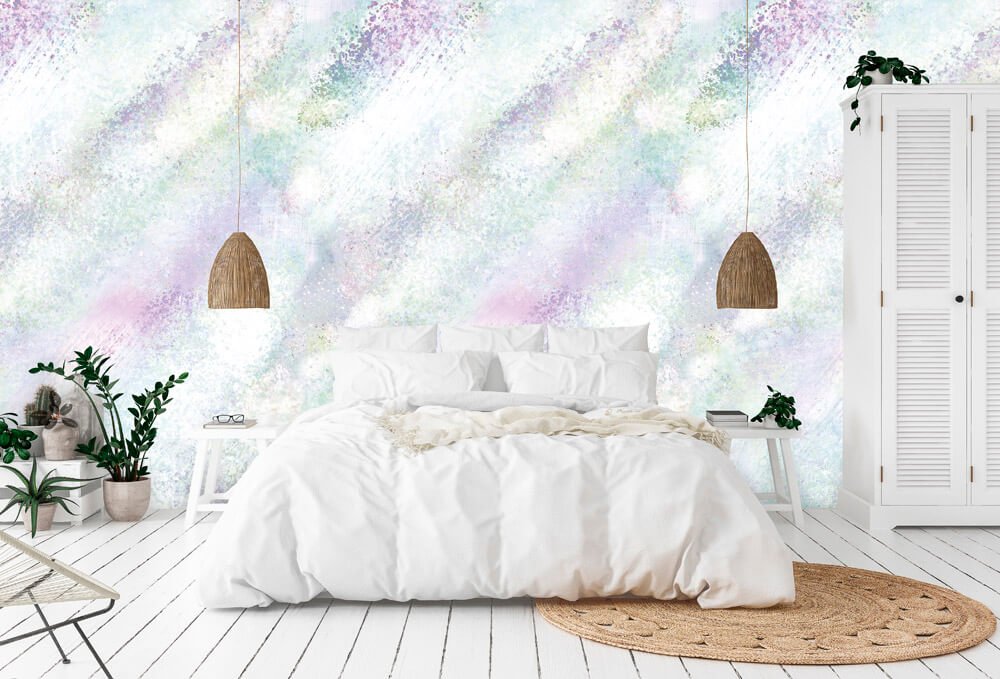 Het Morning Lights behang vangt het zachte ochtendlicht in subtiele pasteltinten. Abstracte vlekken en spatten in lavendel, mintgroen en zacht roze vloeien samen op een lichte achtergrond, als zonlicht dat door ochtenddauw schijnt. Het resultaat is een etherisch, rustgevend behang dat je ruimte met zachtheid vult.
