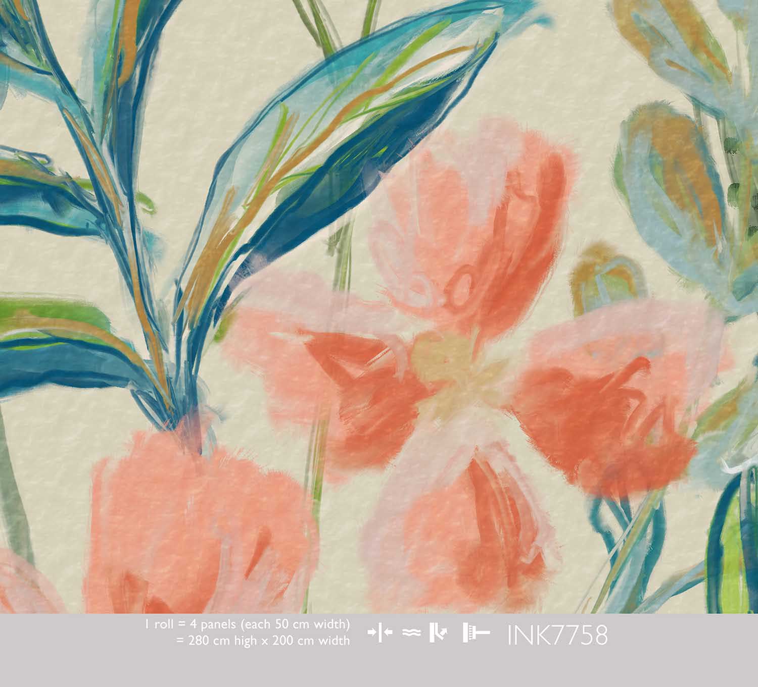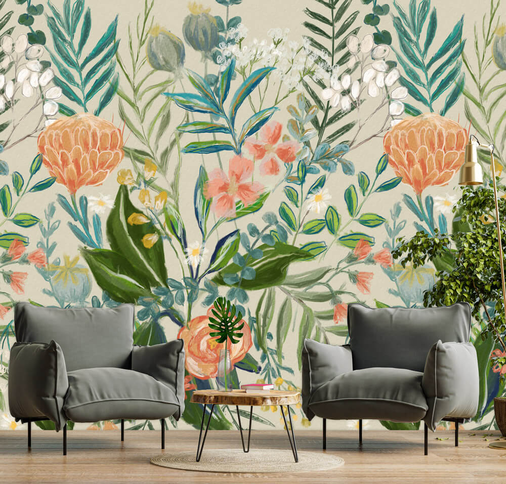 Het Naif Garden behang transformeert je kamer tot een weelderige botanische tuin. Grote, handgeschilderde protea-bloemen in warme koraalroze en oranje tinten worden omringd door tealkleurige bladeren, varens en fijne witte bloesems. De beige achtergrond zorgt voor een warme, uitnodigende basis die de levendige kleuren prachtig laat uitkomen.