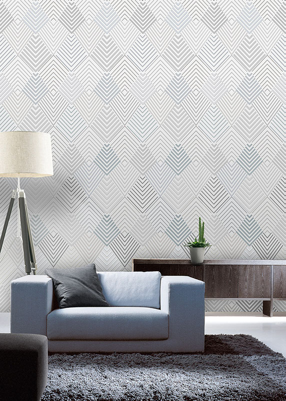 Het Pyramid behang geeft je muur een subtiele, elegante textuur. De ruitvormige, chevron-achtige patronen in lichte grijs- en zilvertinten creeren een fijn geometrisch spel dat diepte toevoegt zonder te domineren. Dit ontwerp is ideaal voor een stijlvolle woonkamer, slaapkamer of hal.