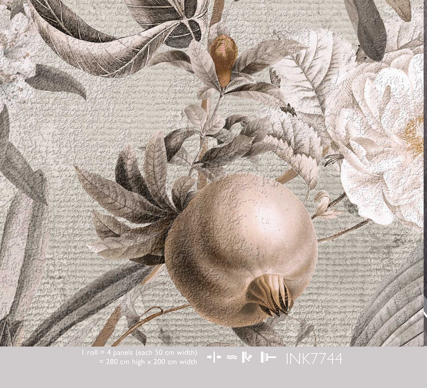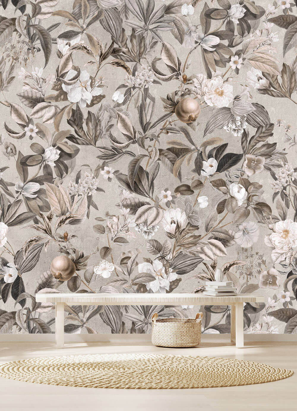 Het Romantic Nature Gray behang is een ode aan de klassieke botanische illustratiekunst. Weelderige bloemen, bladeren, vruchten en bloesems zijn in fijne grijstinten en subtiele beigetonen vastgelegd op een zachte, linnen-achtige achtergrond. De monochrome kleurstelling geeft het ontwerp een verfijnde elegantie die nooit verveelt.