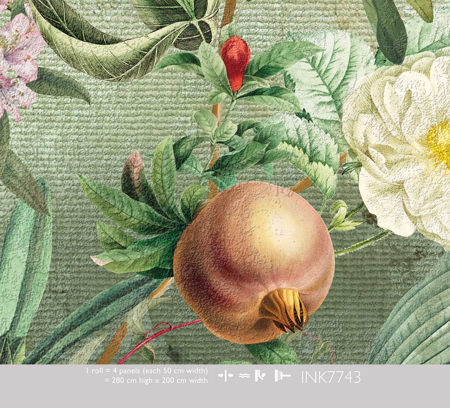 Haal een botanische tuin in huis met het Romantic Nature Moss behang. Rijke groene tinten vormen de basis voor een weelderige compositie van tropische bloemen, grote bladeren, exotische vruchten en delicate bloesems. Roze en witte accenten zorgen voor een zachte, romantische toets in het overwegend groene ontwerp.