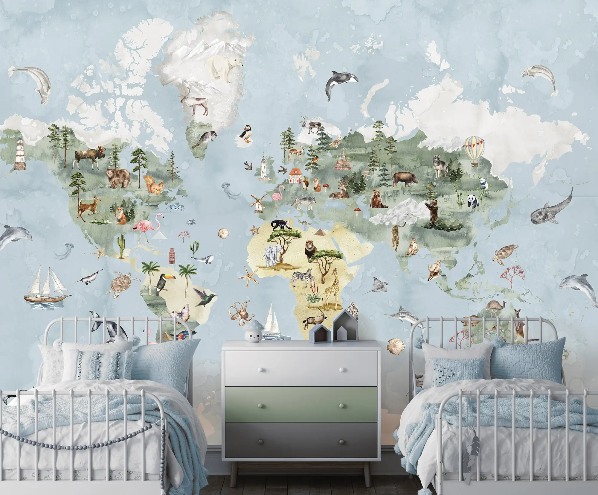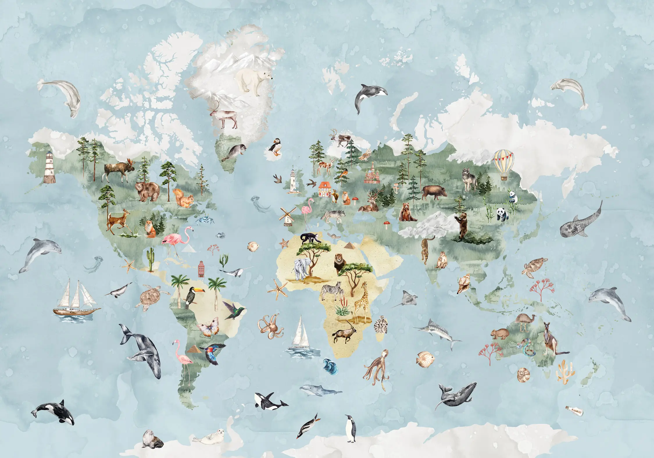 Ontdek de wereld vanuit de kinderkamer met dit prachtige Around the World fotobehang. Op een aquarel wereldkaart in zachte blauwtinten staan tientallen dieren afgebeeld op hun thuiscontinent: van ijsberen en elanden tot giraffen, panda’s en walvissen. Vuurtorens, luchtballonnen en zeilboten maken de ontdekkingsreis compleet. Dit educatieve design is perfect voor een kinderkamer waar avontuur en leren samenkomen.
