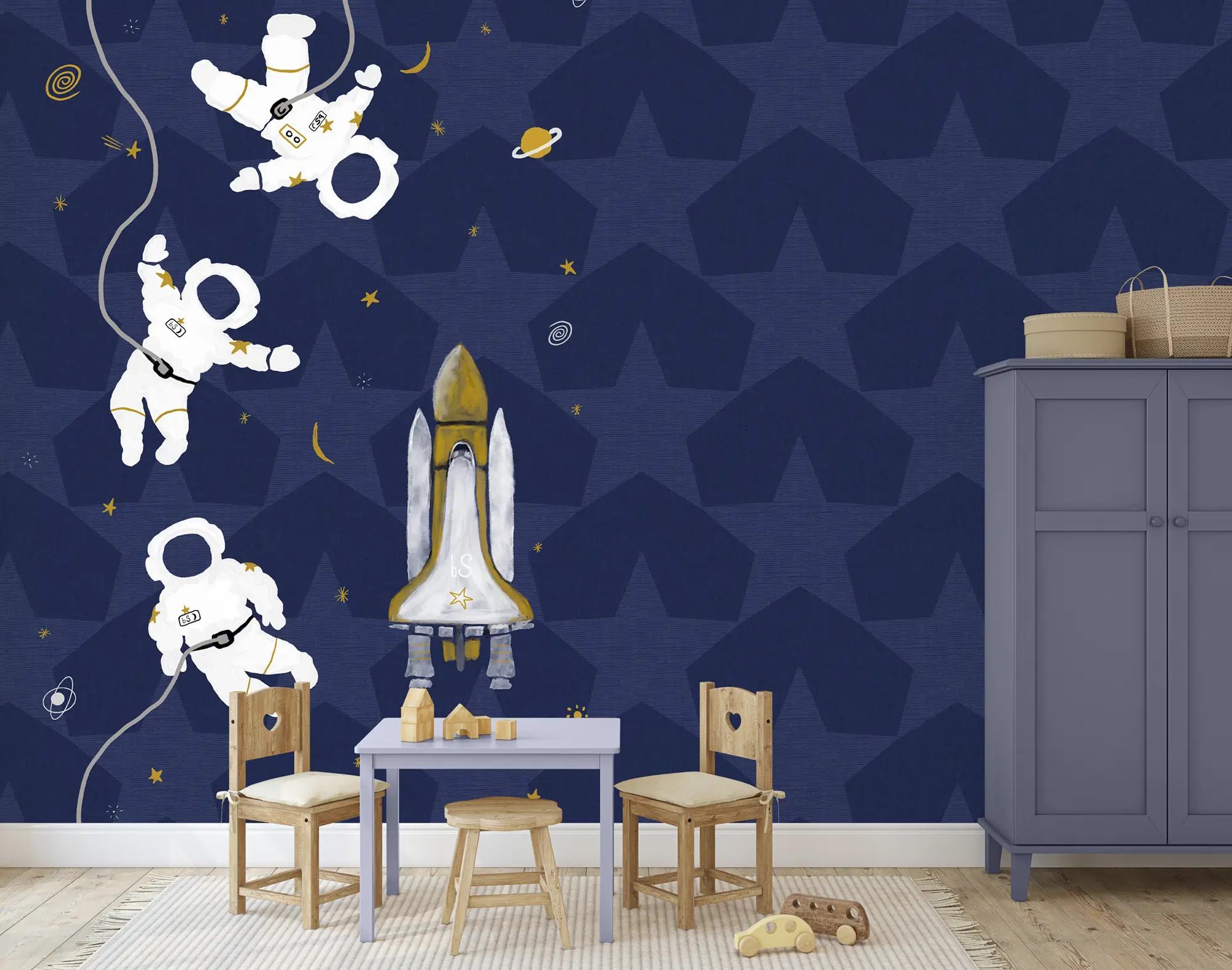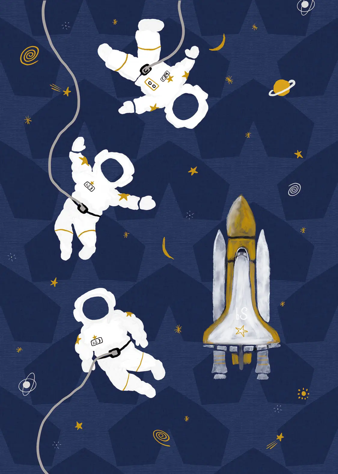 Neem je kind mee op een reis door de ruimte met dit prachtige donkerblauwe ruimtevaart behang. Zwevende astronauten en een imposante spaceshuttle sieren de muur, omringd door sterren, planeten en sterrenstelsels. De achtergrond heeft een subtiel sterrenpatroon dat diepte en sfeer toevoegt. De kleuren donkerblauw, wit en goud geven het geheel een dromerige, avontuurlijke uitstraling. Ideaal voor de kinderkamer of babykamer van een kleine ontdekkingsreiziger.