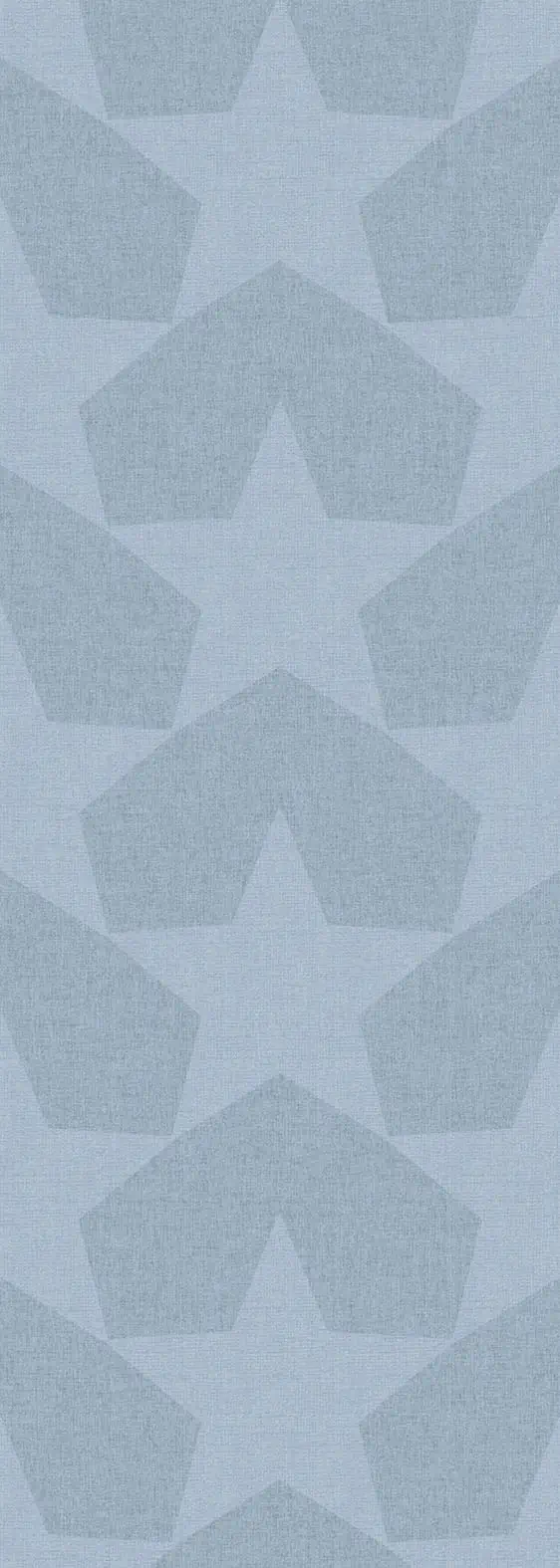 Dit lichtblauwe sterren behang vormt een rustige basis voor de kinderkamer of babykamer. Grote geometrische sterren in toon-op-toon lichtblauw geven de wand een zachte structuur zonder te overheersen. Het is een veelzijdig behang dat mooi combineert met het Beyond Space ruimtevaart design, maar ook op zichzelf prachtig staat. De lichte kleur maakt de kamer ruimtelijk en fris.