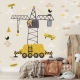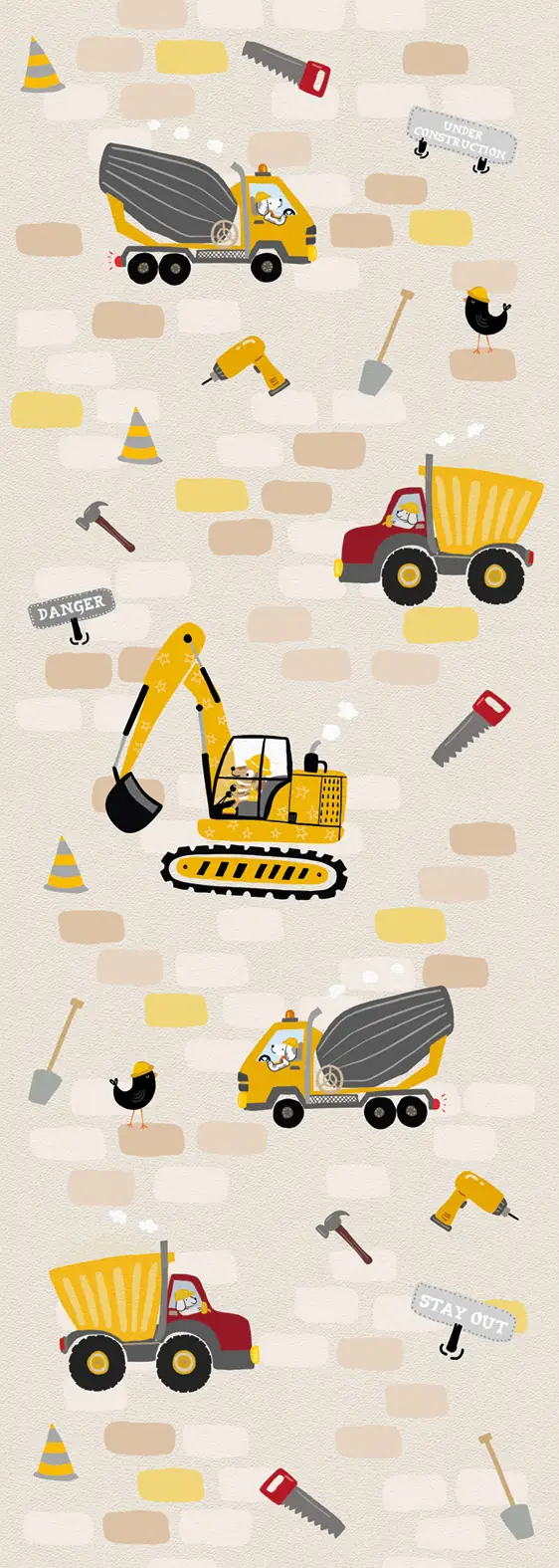 Dit warme kinderbehang brengt de hele bouwplaats naar de kinderkamer of babykamer. Graafmachines, cementwagens en kiepwagens rijden over een gezellige beige achtergrond met zachte bakstenen. Leuke details zoals vogeltjes met bouwhelmen, gereedschap en pylonen maken het geheel af. De warme beige en gele tinten zorgen voor een knusse sfeer.