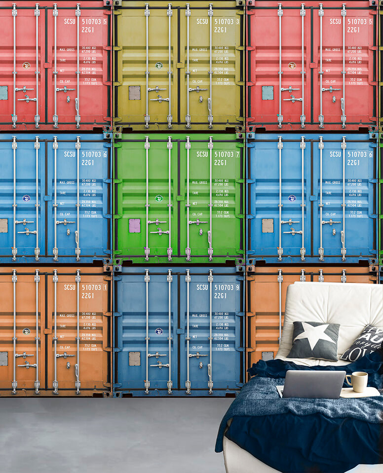 Het Shipyard behang brengt de ruige sfeer van een internationale haven naar je muur. Kleurrijke scheepscontainers in rood, blauw, groen, geel en oranje staan netjes gestapeld, compleet met realistische details als sluitingen, nummers en vrachtlabels. Het design is stoer, grafisch en boordevol kleur.