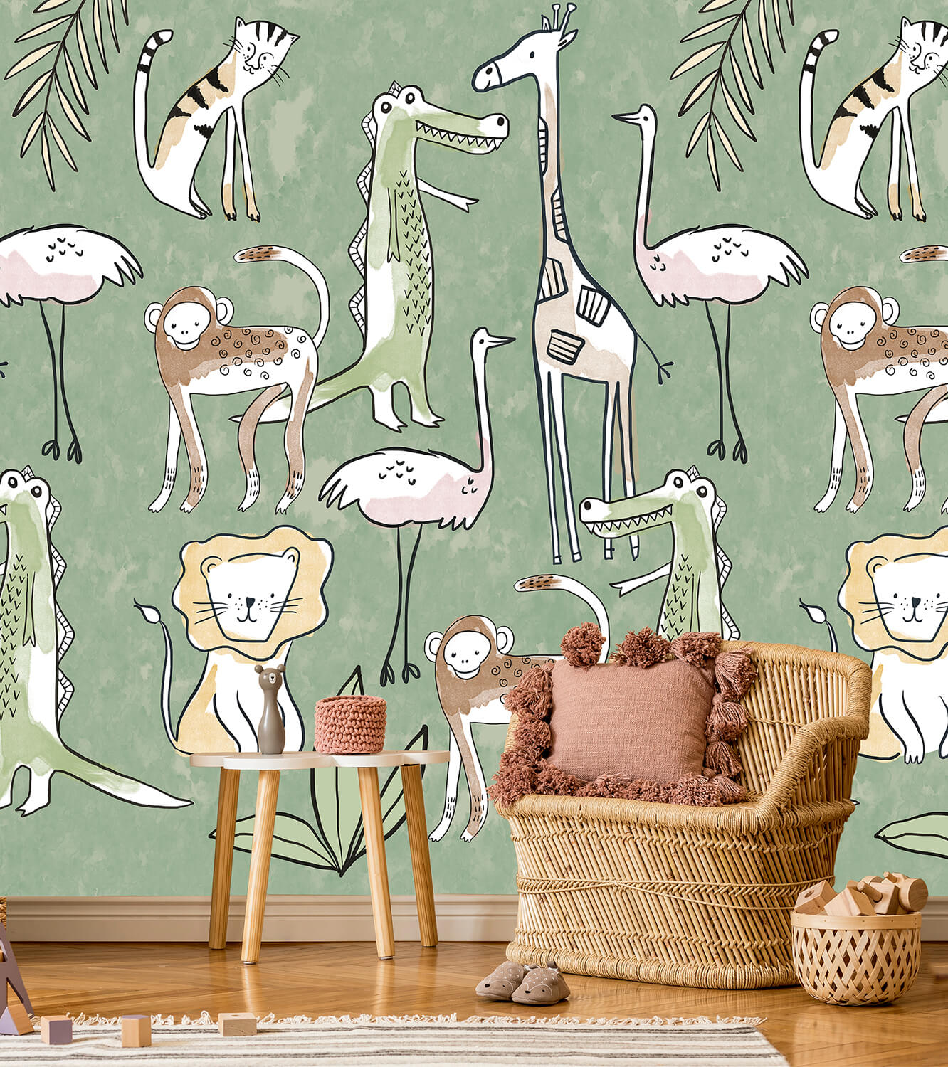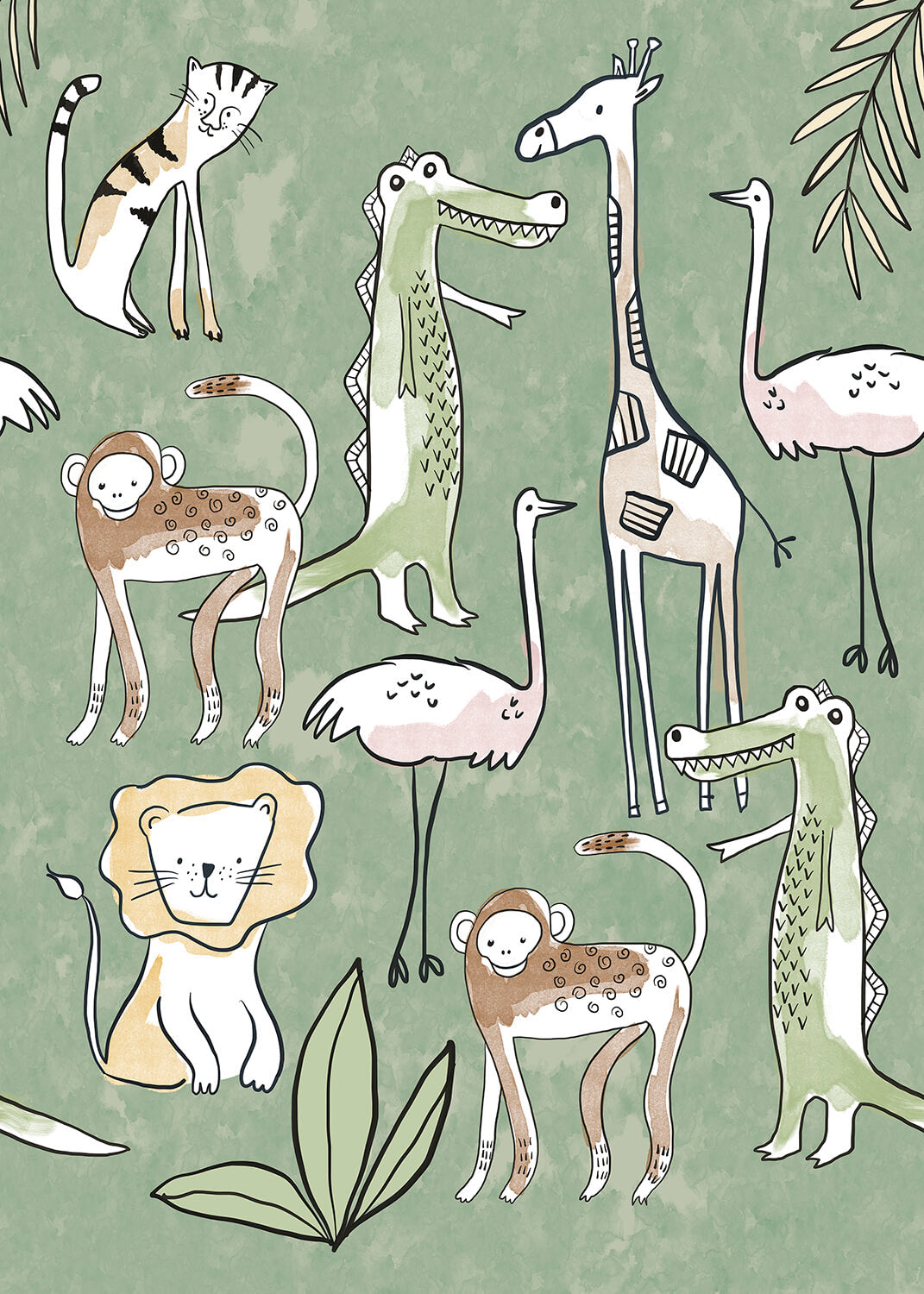 Geef de kinderkamer een speelse uitstraling met dit Simple Jungle behang in groen. Vrolijke leeuwen, lange giraffen, guitige apen en trotse struisvogels zijn in een charmante tekenstijl afgebeeld op een zachte groene achtergrond. Het design is eenvoudig maar vol karakter en brengt een glimlach op elk gezicht.