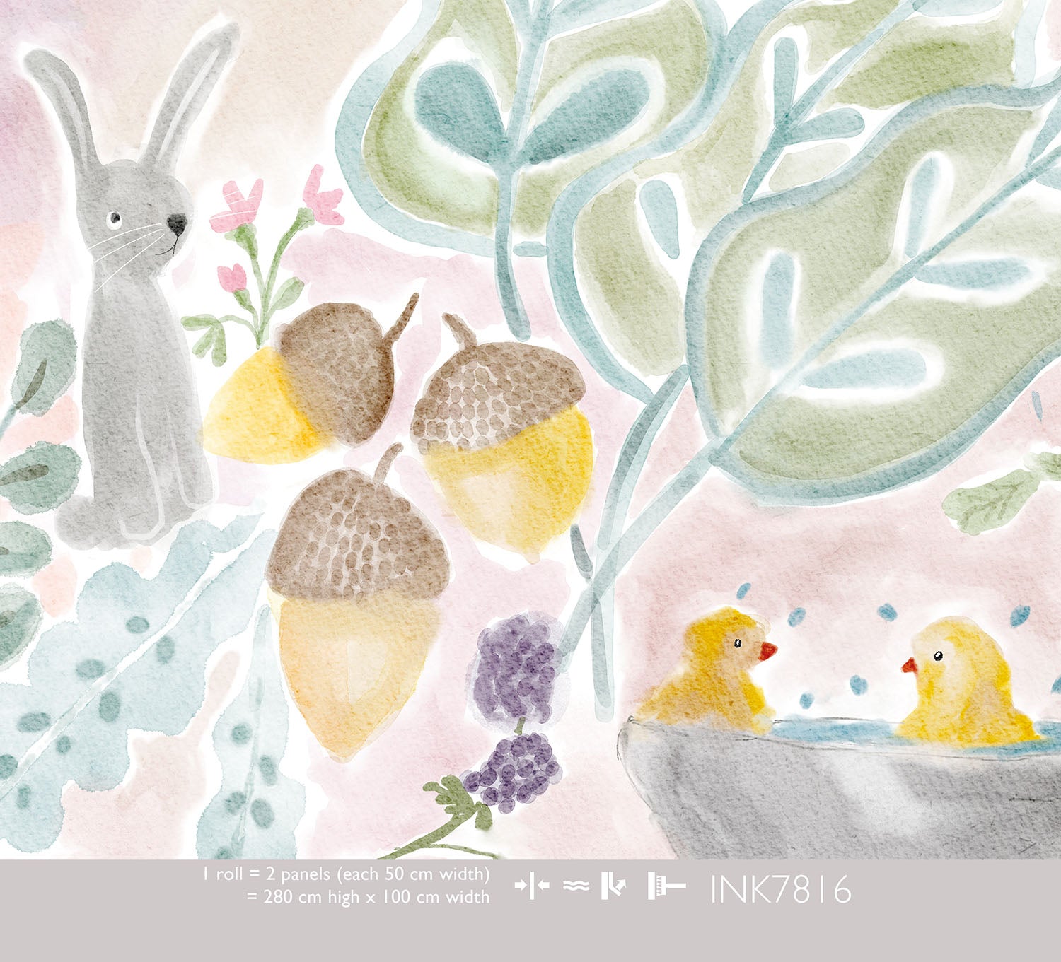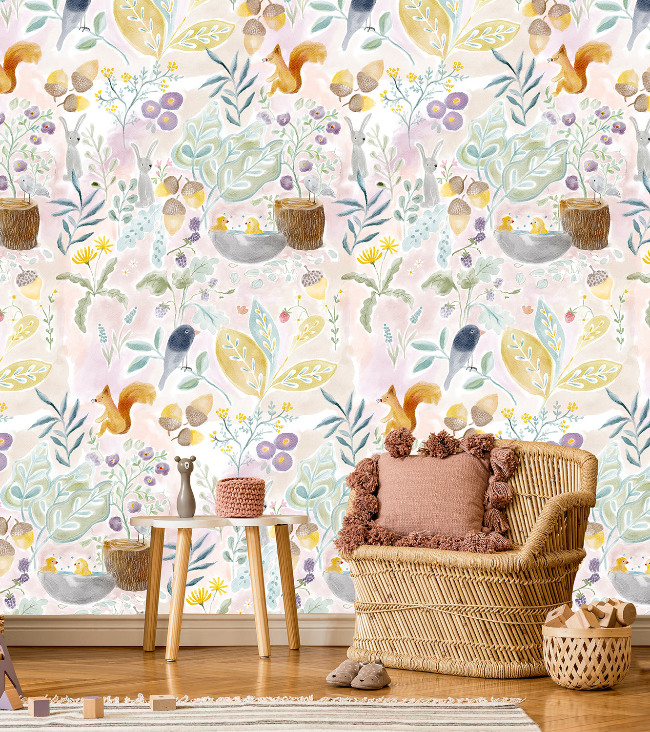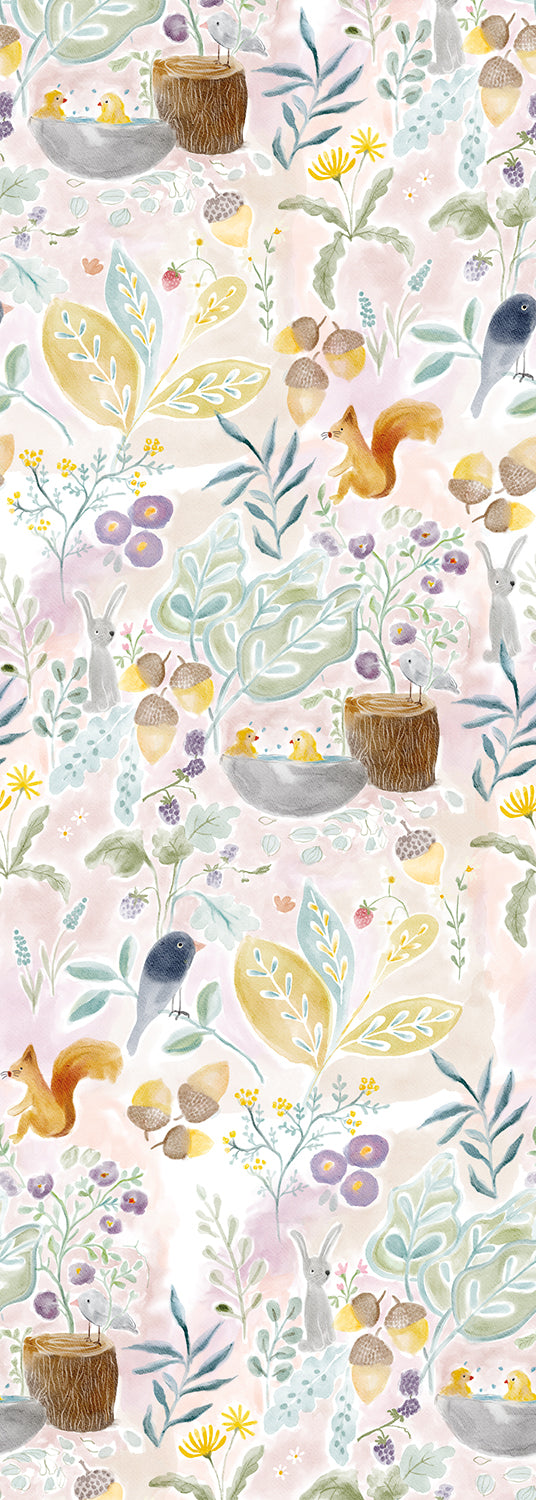 Creeer een sprookjesachtige sfeer in de kinderkamer met dit prachtige Sweet Garden behang in warme tinten. Schattige eekhoorntjes springen tussen de takken, vogeltjes nestelen zich in het groen en overal bloeien zachte bloemen in pastelkleuren. De warme roze, gele en mintgroene tinten geven de kamer een knusse, uitnodigende uitstraling.