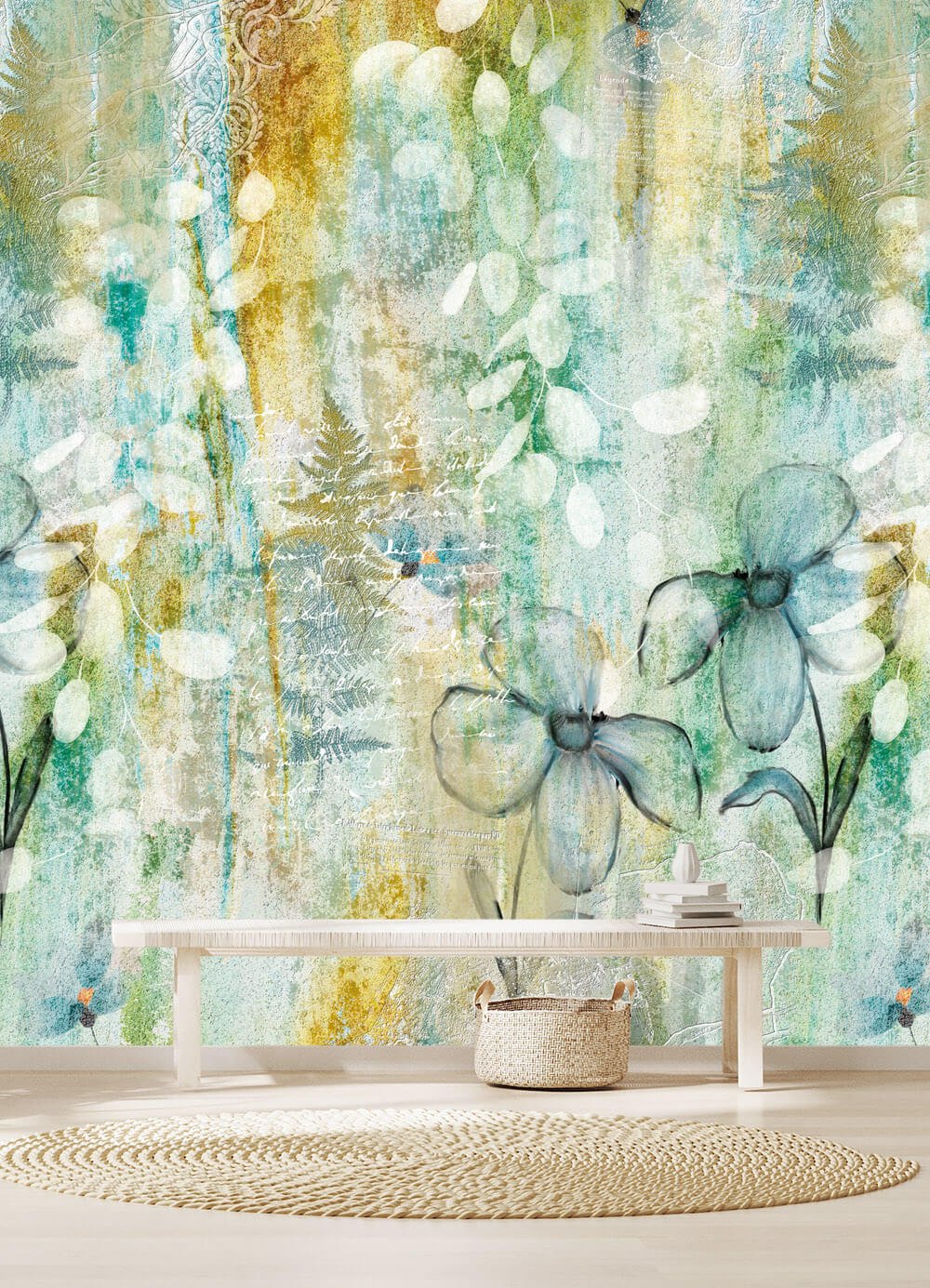 Het Vintage Forest behang tovert je muur om tot een mysterieus, betoverend bos. Transparante bloemen en varens lijken te zweven in een wereld van aquablauw, groen en goudgele tinten. Het artistieke, gelaagde effect doet denken aan zonlicht dat door bladeren filtert, waardoor een dromerige en rustgevende sfeer ontstaat.